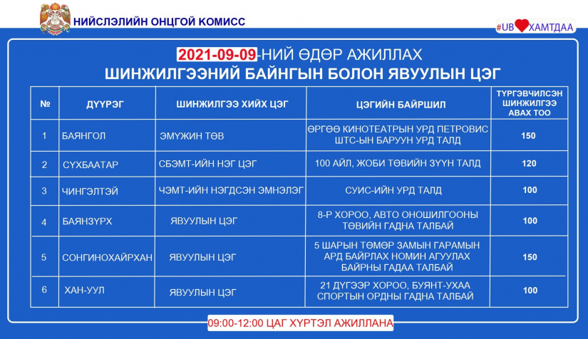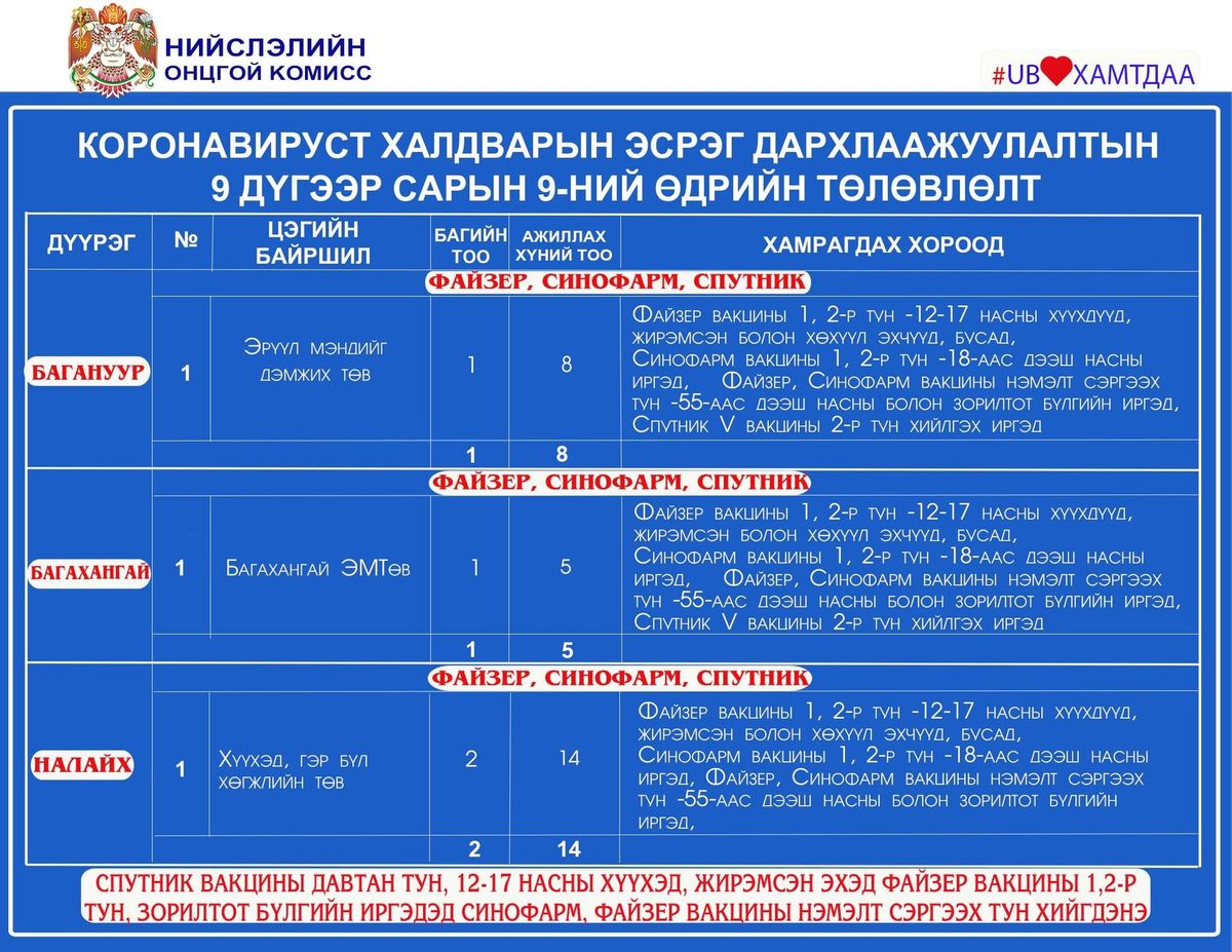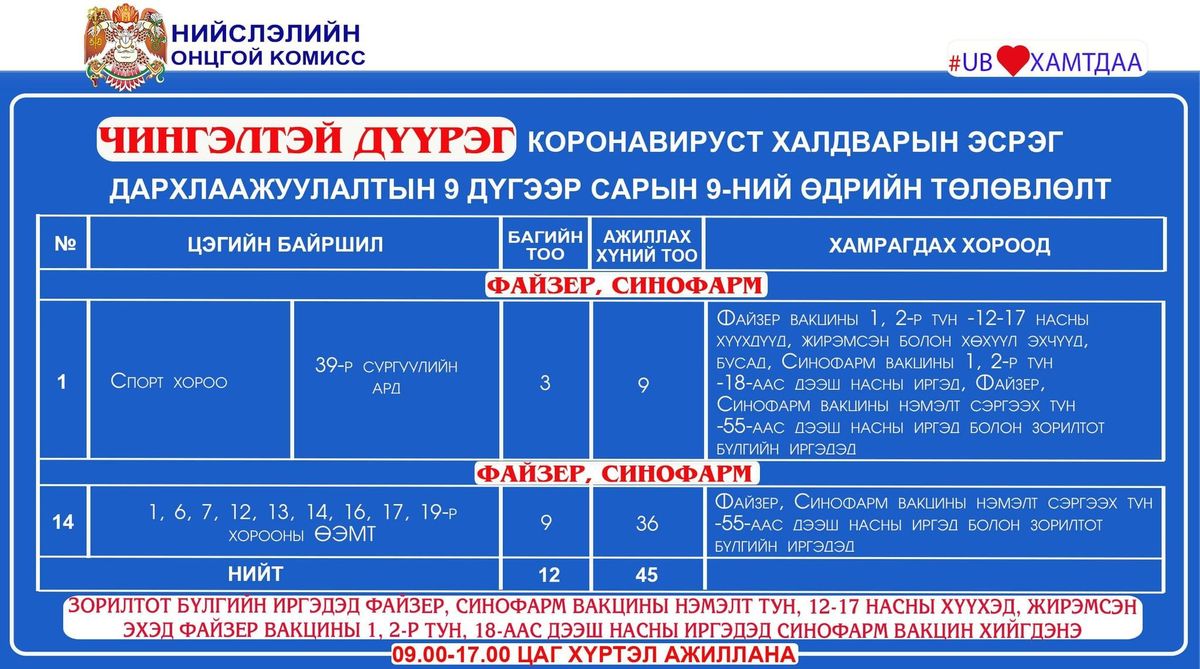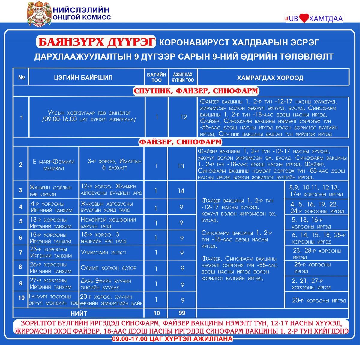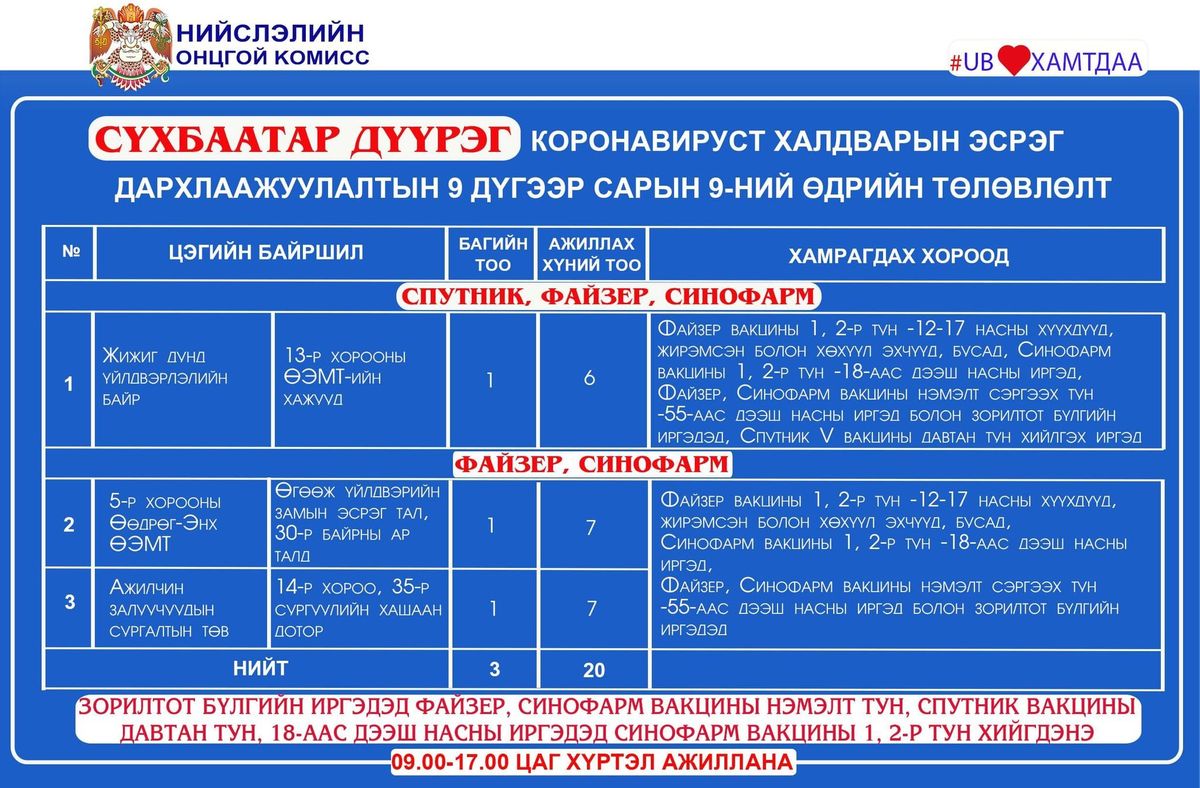 Өнөөдөр буюу 2021 оны есдүгээр сарын 9-ний өдөр Улаанбаатар хотод явуулын 1, суурин 61 цэгт 78 багийн 406 эмч, ажилтан ажиллана. Тэд 7552 иргэнийг дархлаажуулахаар төлөвлөлөө. Дархлаажуулалтын цэгүүд 09:00-17:00 цаг хүртэл ажиллана.