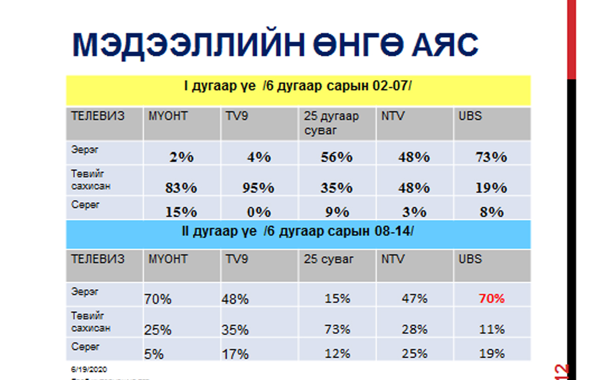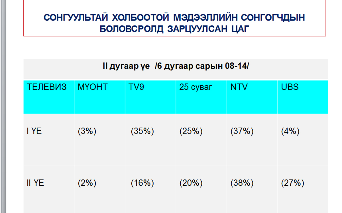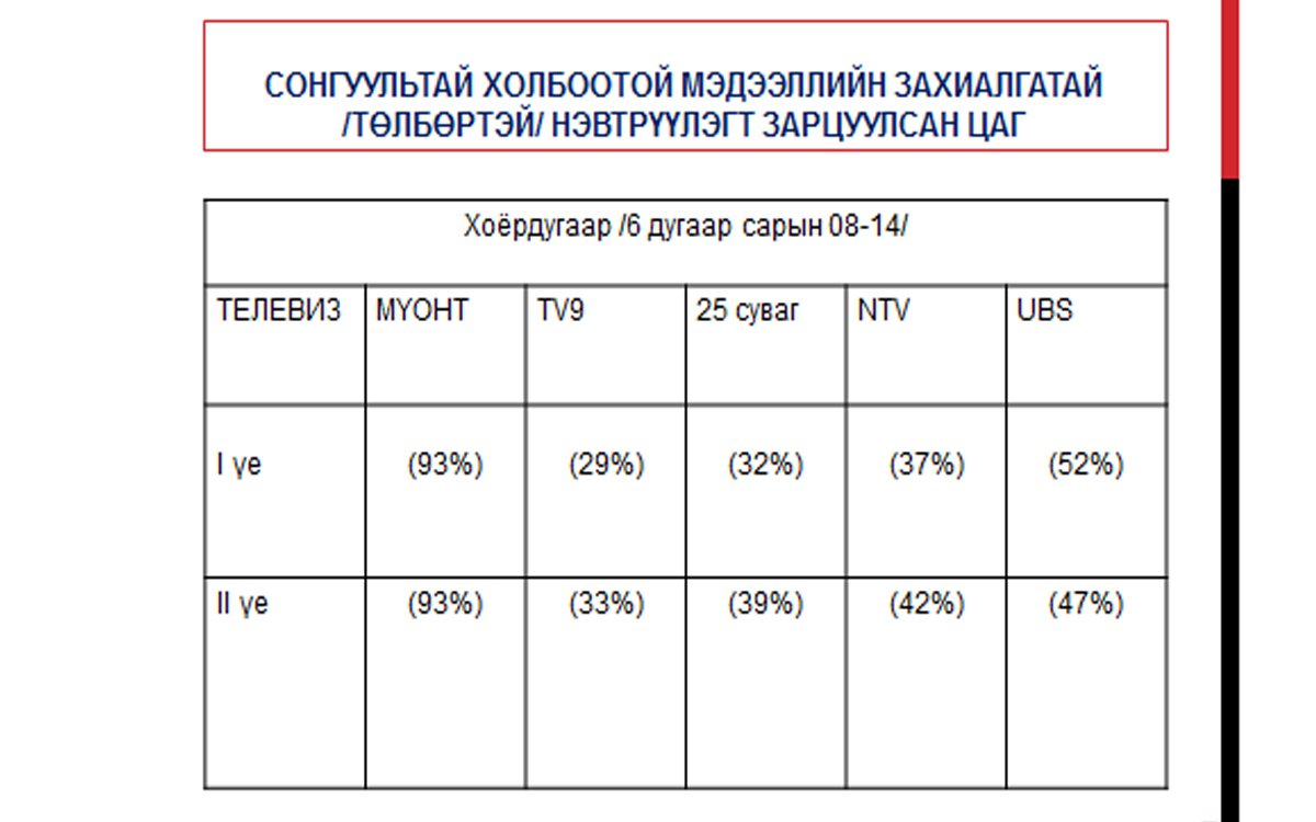 УИХ-ын 2020 оны сонгуулийн үеэр ХМХ-ийн гүйцэтгэх үүргийг сайжруулах, ХМХ-ээр явуулж буй сурталчилгааны тэгш, тэнцвэрт байдал хэрхэн хангагдаж буйг олон нийтэд ойлгуулах, далд сурталчилгааг илрүүлэх, Сонгуулийн тухай хууль болон ХХЗХ, СЕХ-ны хамтран баталсан “Радио телевизээр сонгуулийн сурталчилгаа нэвтрүүлэх, хяналт тавих” журмын хэрэгжилтэд хяналт зорилгоор Глоб Интернэшнл төвөөс хийж буй телевизийн мониторингийн хоёр дахь үеийн дүн гарлаа.