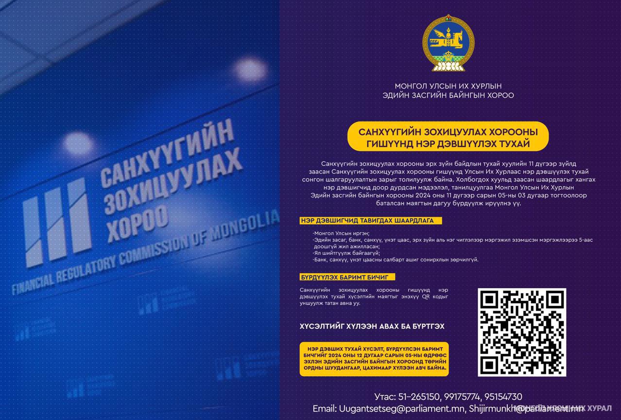 Санхүүгийн зохицуулах хорооны эрх зүйн байдлын тухай хуулийн 11 дүгээр зүйлд заасан Санхүүгийн зохицуулах хорооны гишүүнд Улсын Их Хурлаас нэр дэвшүүлэх тухай сонгон шалгаруулалтын зарыг толилуулж байна. Холбогдох хуульд заасан шаардлагыг хангах нэр дэвшигчид доор дурдсан мэдээлэл, танилцуулгаа Монгол Улсын Их Хурлын Эдийн засгийн байнгын хорооны 2024 оны 11 дүгээр сарын 05-ны 03 дугаар тогтоолоор баталсан маягтын дагуу бүрдүүлж ирүүлнэ үү.