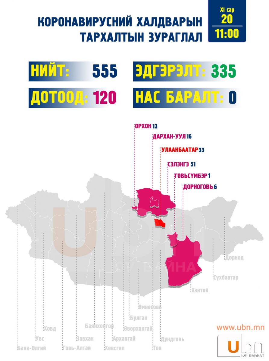 Монгол Улсад батлагдсан коронавируст халдварын тохиолдлын тоо 555 боллоо. Үүнээс эдгэрсэн 335 хүн байна” гэв.