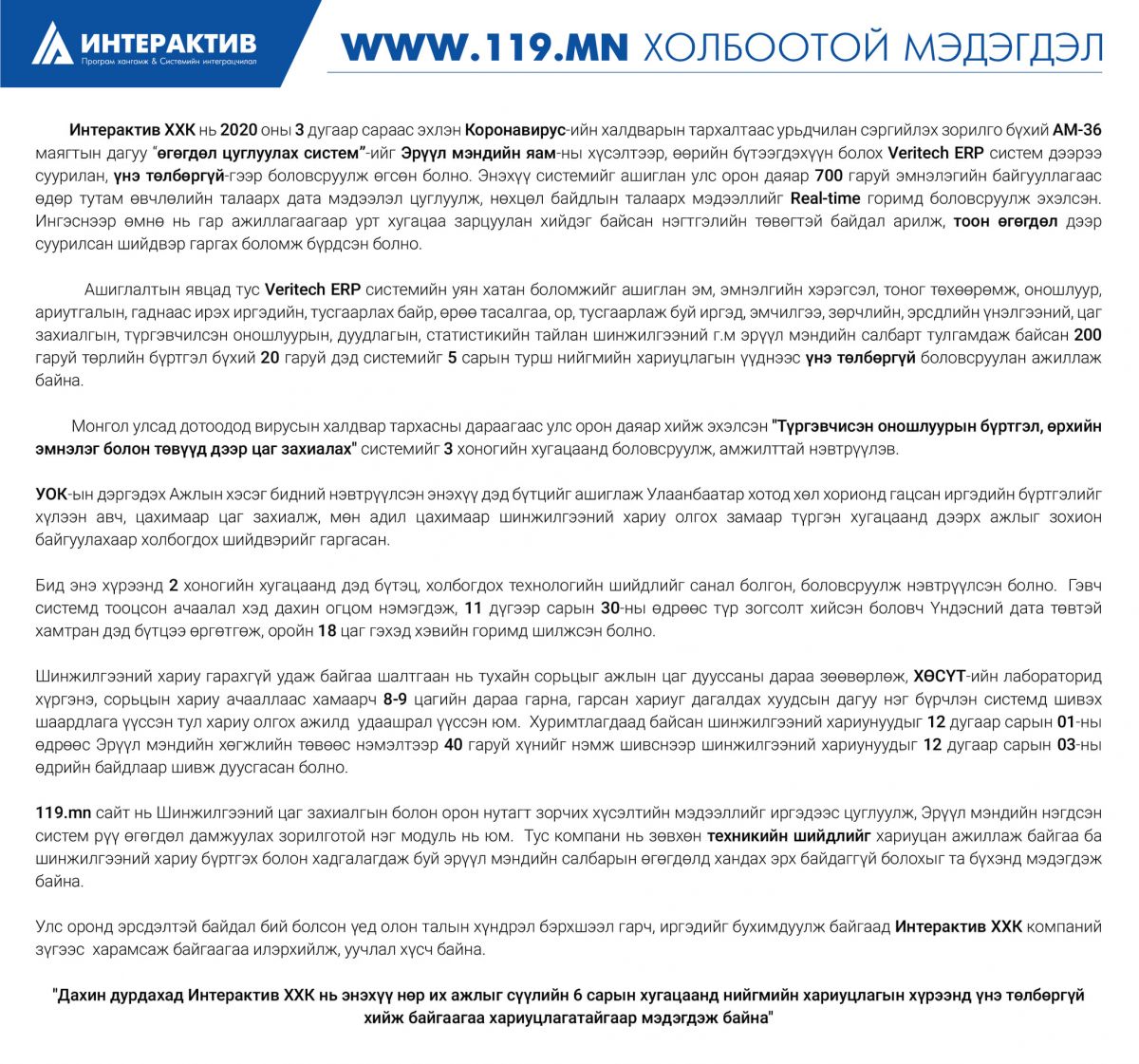 Интерактив ХХК нь 2020 оны 3 дугаар сараас эхлэн Коронавирус-ийн халдварын тархалтаас урьдчилан сэргийлэх зорилго бүхий АМ-36 маягтын дагуу “өгөгдөл цуглуулах систем”-ийг Эрүүл мэндийн яам-ны хүсэлтээр, өөрийн бүтээгдэхүүн болох Veritech ERP систем дээрээ суурилан, үнэ төлбөргүй-гээр боловсруулж өгсөн болно. Энэхүү системийг ашиглан улс орон даяар 700 гаруй эмнэлэгийн байгууллагаас өдөр тутам өвчлөлийн талаарх дата мэдээлэл цуглуулж, нөхцөл байдлын талаарх мэдээллийг Real-time горимд боловсруулж эхэлсэн. Ингэснээр өмнө нь гар ажиллагаагаар урт хугацаа зарцуулан хийдэг байсан нэгтгэлийн төвөгтэй байдал арилж, тоон өгөгдөл дээр суурилсан шийдвэр гаргах боломж бүрдсэн болно.
