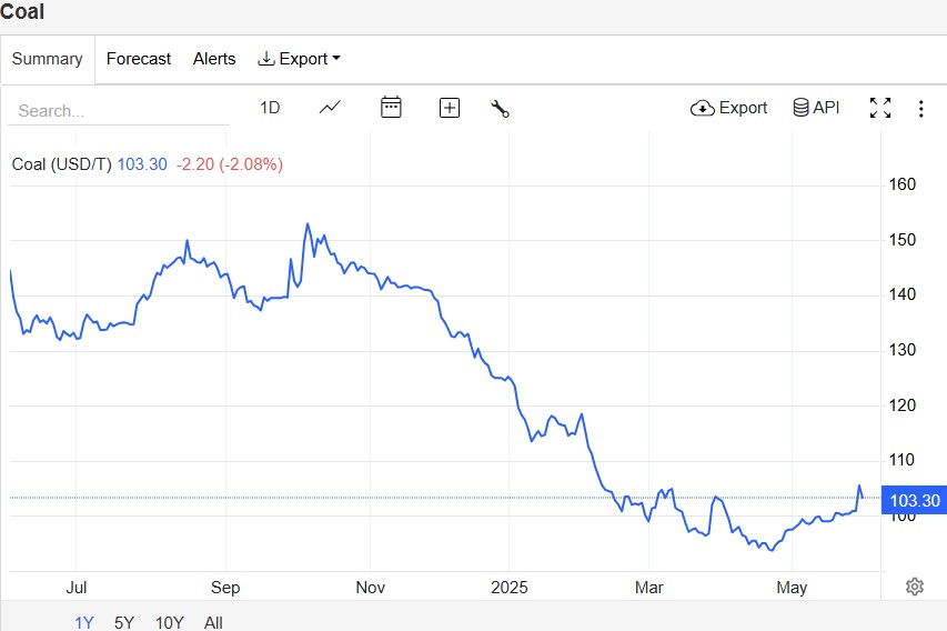 Энэ онд манай улс 83 сая тонн нүүрс экспортлохоор төлөвлөж төсвийн тэнцвэржүүлсэн орлого, тусламжийн дүн 33.5 их наяд төгрөг байхаар төсөөлж байгаа бол нүүрсний дундаж үнийг 105 ам.доллар байхаар 2025 оны төсөвт тусгасан. Өнөөдрийн байдлаар дэлхийн зах зээлд нүүрсний үнэ тонн тутам нь 103 ам.доллар болж 2 хувиар буураад байна. Хэдий тавдугаар сард гарснаас хойш уналтад ороод байсан нүүрсний үнэ сэргэж 100 ам.долларт хүрсэн ч сүүлийн өдрүүдэд дахин буурч байна.