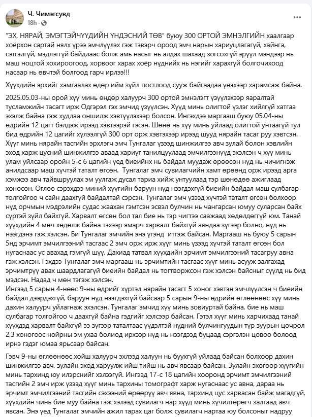 2025.05.03-ны орой хүү минь өндөр халуурч 300 ортой эмнэлэгт үзүүлэхээр яаралтай тусламжийн тасагт ирж Одгэрэл гэх эмчид үзүүлсэн. Хүүд минь олигтой үзлэг хийлгүй хатгаа эхэлж байна гэж худлаа оншилж хэвтүүлэхээр болсон. Ингэхдээ маргааш буюу 05.04-ны өдрийн 12 цагт бэлдэж ирээд хэвтээрэй гэсэн. Шөнө нь хүү минь уйлаад олигтой унтаагүй тул бид өдрийн 12 цагийг хүлээлгүй 300 орт орж хэвтэхээр ирээд шууд нярайн тасаг руу хэвтсэн. Хүүг минь нярайн тасгийн эрхлэгч эмч Тунгалаг үзээд шинжилгээ авч зулай болон хэвлийн эход харж цусний шинжилгээ аваад хариуг танилцуулаад эмчилгээнүүд эхэлсэн ч хүү минь улам уйлсаар оройн 5-с 6 цагийн үед биеийнх нь байдал муудаж өрөөсөн нүд нь чичигнэж анилдсаар маш хүчтэй таталт өгсөн. Тунгалаг эмч сувилагчийн хамт өрөөнд орж ирээд арга хэмжээ авч тайвшруулах эм уулгаж дусал тариа хийж унтуулаад тэр шөнөдөө ажиглаад хоносон. Өглөө сэрэхдээ миний хүүгийн баруун нүд нээгдэхгүй биеийн байдал маш сулбагар толгойгоо ч сайн даахгүй байдалтай сэрсэн. Тунгалаг эмч үзээд хүчтэй таталт өгсөн болхоор нүд орчмын мэдрэлийн судас жаахан гэмтсэн эсвэл булчин нь чангарсан юмуу суларсан байх сүртэй зүйл байхгүй. Харвалт өгсөн бол тал бие нь тэр чигтээ саажаад хөдөлдөггүй юм. Танай хүүхдийн 4 мөч хөдөлж байна тэхээр ямарч харвалт байхгүй аяндаа зүгээр болно, нүд нь нээгдэнэ гэж хэлсэн. Би Тунгалаг эмчийн энэ үгэнд итгэж байсан. Маргааш нь буюу 5 сарын 5нд эрчимт эмчилгээний тасгаас 2 эмч орж ирж хүүг минь үзээд хүчтэй таталт өгсөн бол нугаснаас ус авахад гэмгүй шүү. Дахиад татвал хүүхдийн эрчимт эмчилгээний тасагруу авна гэж хэлсэн. Гэхдээ Тунгалаг эмч маргааш нь эрчимтийн тасгаас хүүг минь асууж залгахад эрчимтрүү авах шаардлагагүй биеийн байдал нь тогтворжсон гэж хэлсэн байсныг сүүлд нь бид мэдсэн. Надад ч мөн тэгэж хэлсэн.