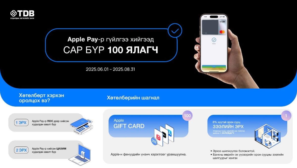 Худалдаа Хөгжлийн Банк дэлхийн шилдэг төлбөр тооцооны шийдэл болох Apple Pay үйлчилгээг харилцагч нартаа зориулан 2024.12 сард Монгол улсад нэвтрүүлсэн. Үргэлжлүүлэн Apple Pay үйлчилгээг хамгийн идэвхтэй ашигласан харилцагч нараа урамшуулах хөтөлбөрөө 5-р сарын 31-г дуустал хугацаанд зарлаад байсан билээ. Тэгвэл энэхүү урамшуулалт хөтөлбөр энэ зуны турш үргэлжлэхээр боллоо.