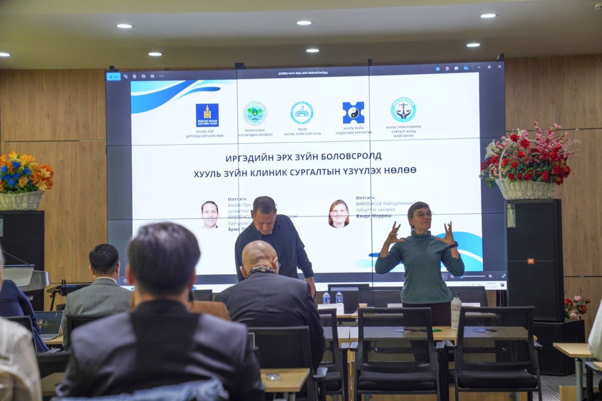 “Иргэдийн эрх зүйн боловсролд хууль зүйн клиник сургалтын үзүүлэх нөлөө” сэдэвт сургалтын чиглүүлэгч багшаар “Babseacle” олон улсын байгууллагын үүсгэн байгуулагч, Ерөнхий захирал, Брюс А.Ласки, Гүйцэтгэх захирал Вэнди Морриш нар ажиллаж, сургалтын хүрээнд оролцогчидтой үзэл бодлоо илэрхийлэн, санал солилцлоо.