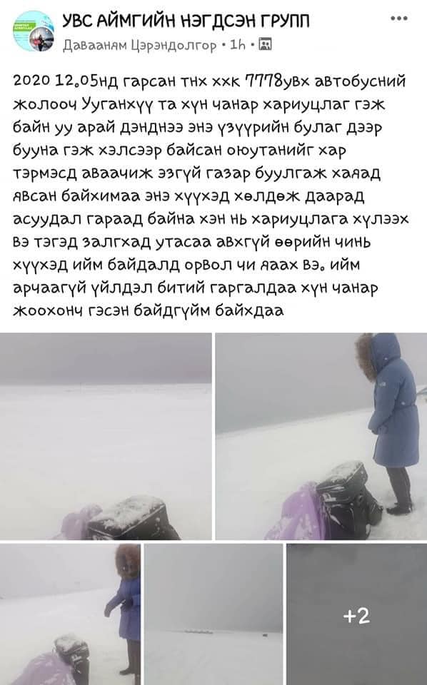 Улаанбаатар-Увс чиглэлийн хот хоорондын автобусны жолооч зорчигчоо цасан шуурганаар, хээр буулгаж үлдээсэн гэх мэдээлэл олон нийтийн сүлжээнд гараад байна.