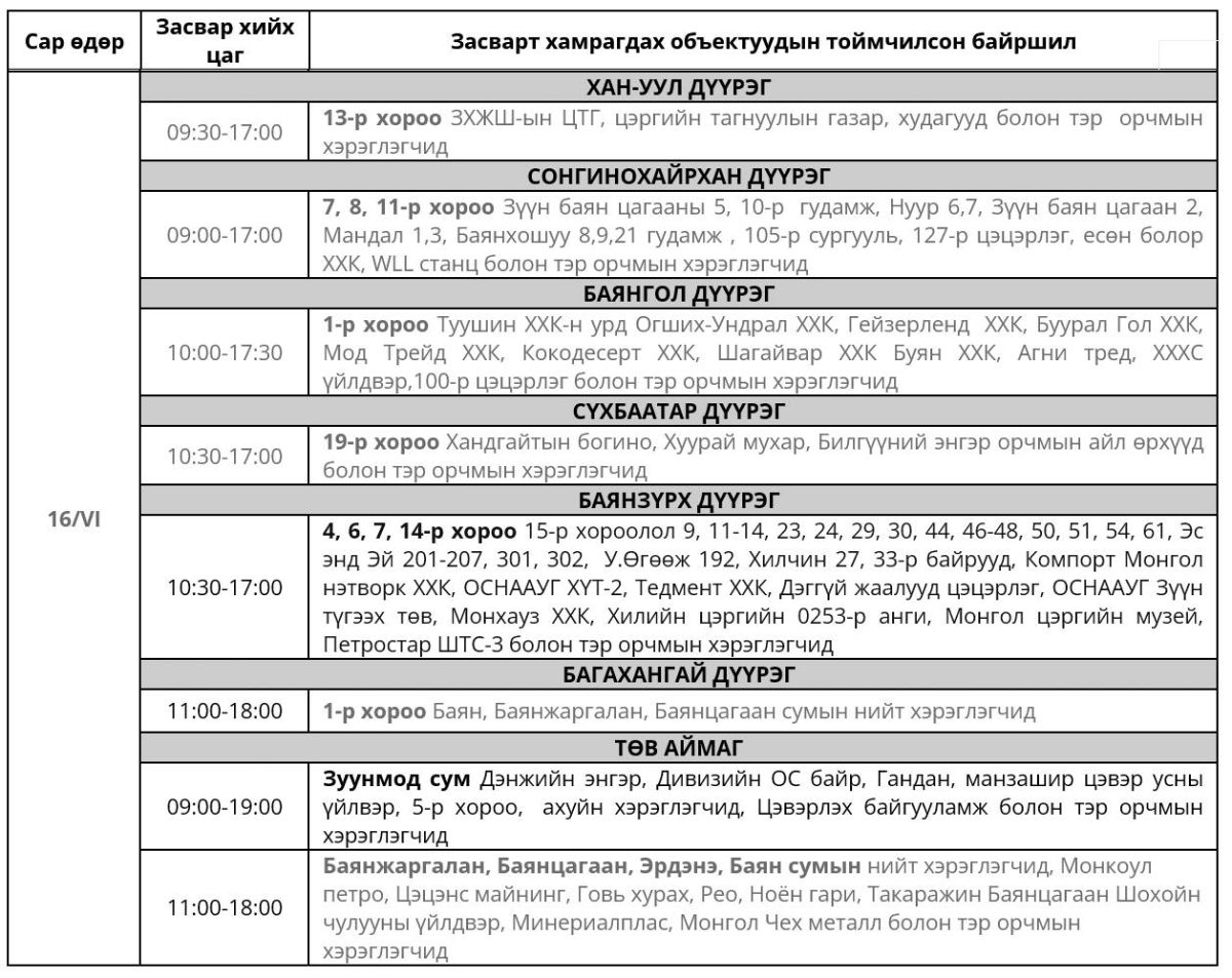 Өнөөдөр /2025.06.16/ нийслэлийн зургаан дүүрэг, нэг аймагт цахилгаан түр хязгаарлана.