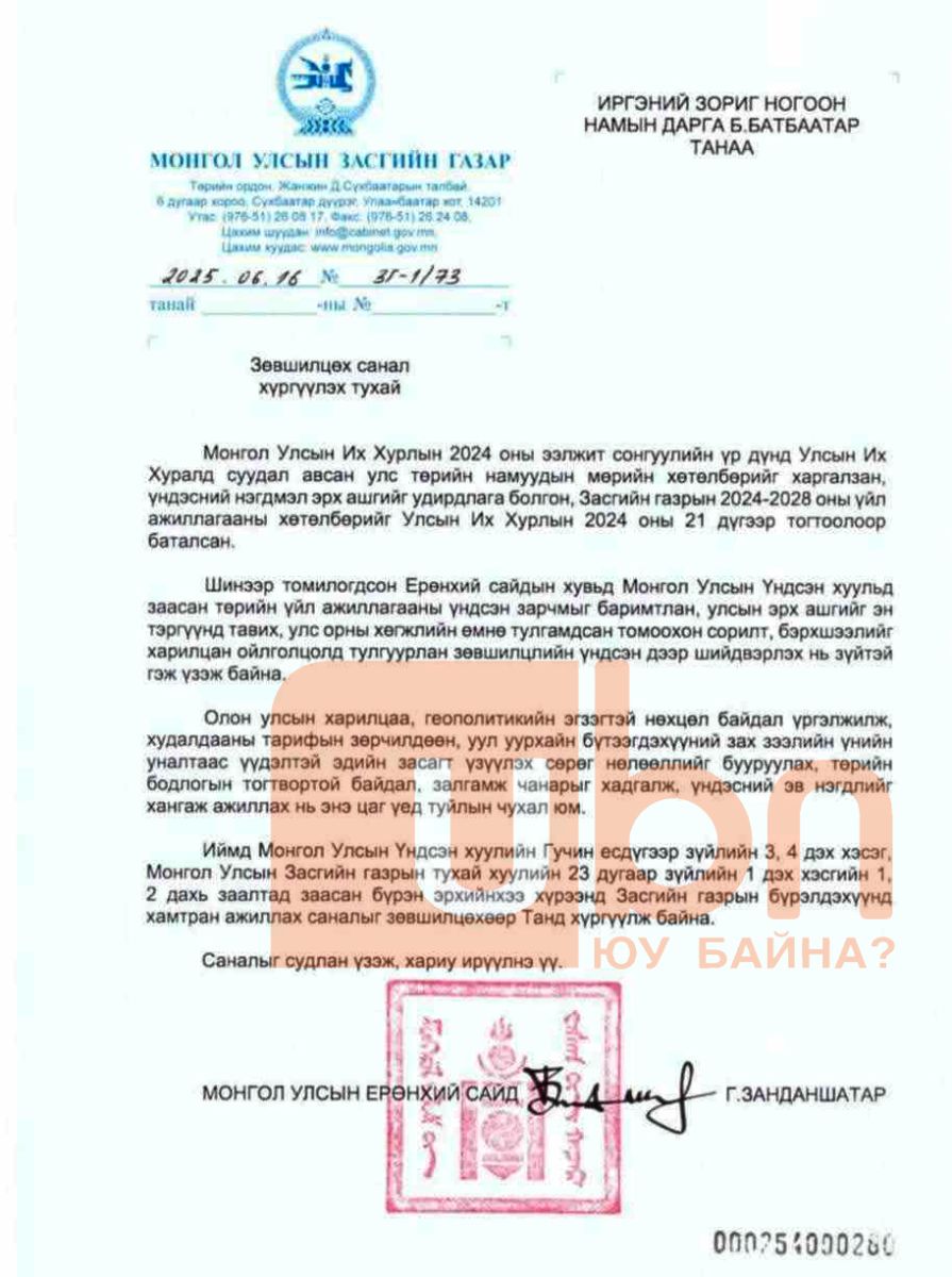 Тодруулбал, тэрбээр эл албан бичигт "Олон улсын харилцаа, геополитикийн эгзэгтэй нөхцөл байдал үргэлжилж, худалдааны тарифын зөрчилдөөн, уул уурхайн бүтээгдэхүүний зах зээлийн үнийн уналтаас үүдэлтэй эдийн засагт үзүүлэх сөрөг нөлөөллийг бууруулах, төрийн бодлогын тогтвортой байдал, залгамж чанарыг хадгалж, үндэсний эв нэгдэл хангаж ажиллах нь энэ цаг үед туйлын чухал юм" хэмээн онцолжээ.