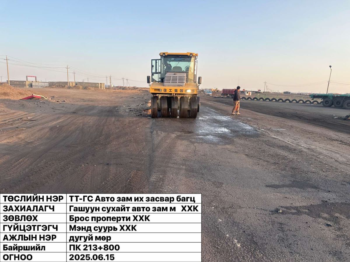 Таван толгой Гашуун сухайт авто замын 213–218 дахь км-ийн хоорондох авто замын хэсэгт эвдрэлийг засварлах ажлыг эхлүүлээд байна. Энэхүү засварын ажлыг “Мэнд Суурь” ХХК гүйцэтгэж, гүйцэтгэлийн явцад зөвлөх үйлчилгээний үүргийг “Брос Проперти” ХХК хариуцан ажиллаж байна.