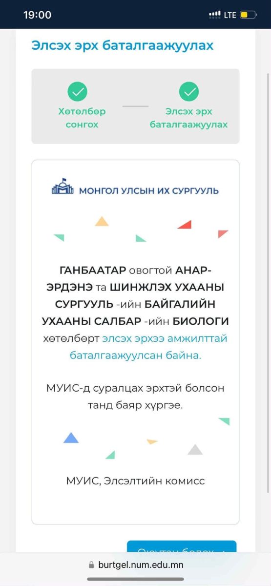 Хайртай охин минь нийслэлийн 130-р дунд сургуулийг төгсөж МУИС-ийн биологийн ангид элсэн орсон билээ. Намар хичээл эхлээд удаагүй байхад Монгол Улсын Ерөнхийлөгчийн илгээлт 2100 хөтөлбөрт тэнцсэн тухай мэдээ авч, аав ээж, ах дүү, ачит багш нараа баярлуулан бахархуулж байсан нь саяхан.