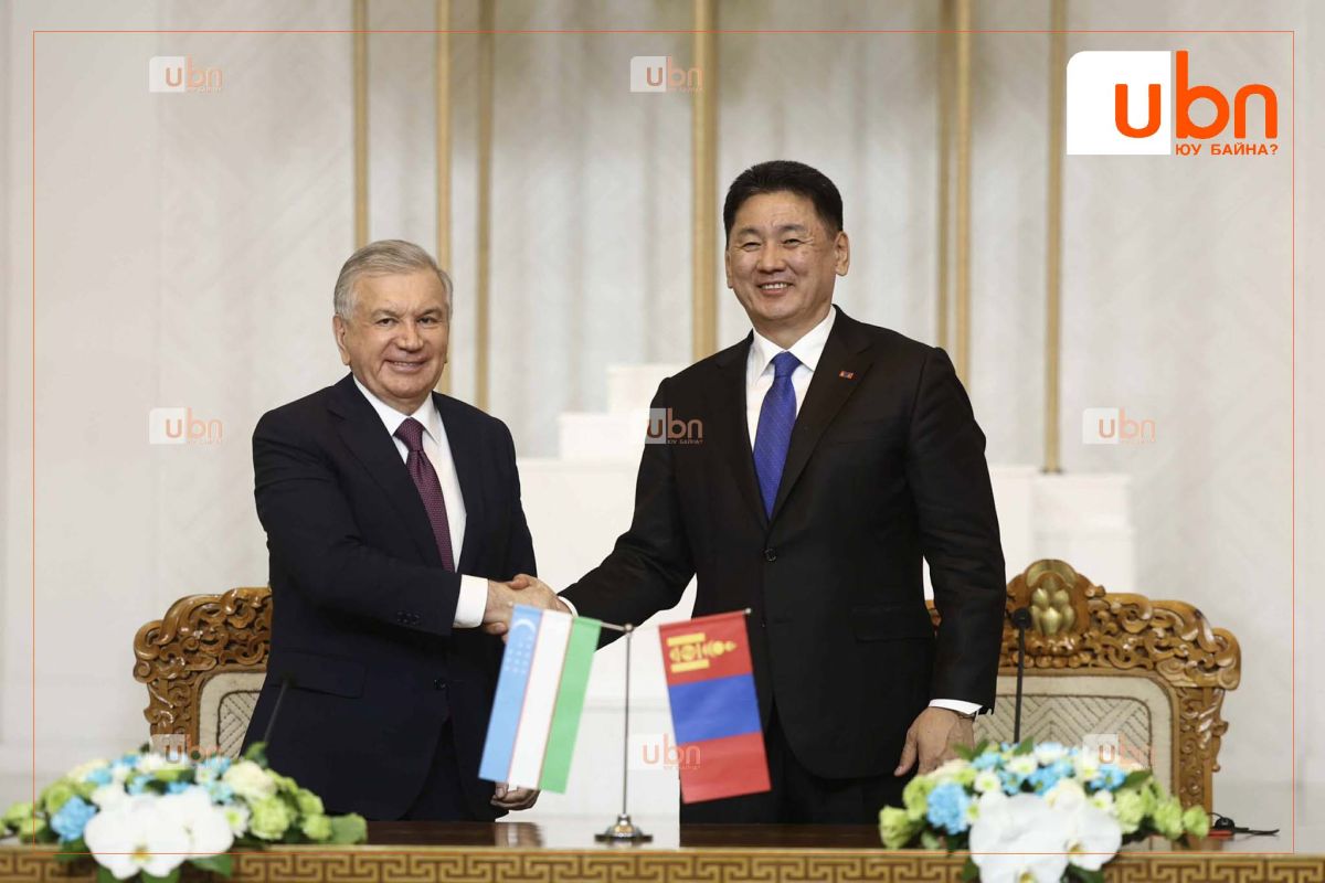 Айлчлалын үр дүнгээр “Монгол Улс, Бүгд Найрамдах Узбекистан Улсын хооронд Иж бүрэн түншлэлийн харилцаа тогтоох тухай хамтарсан тунхаглал” гаргаж байгаадаа баяртай байна. Монгол Улсын Ерөнхийлөгчийн 2024 онд Узбекистан Улсад хийсэн төрийн айлчлалын үеэр “Агаарын болон олон улсын автотээврийн харилцааны тухай Засгийн газар хоорондын хэлэлцээр”, “Аялал жуулчлалын салбарт хамтран ажиллах тухай Засгийн газар хоорондын хэлэлцээр” болон худалдаа, эдийн засаг, аялал жуулчлал, хөдөө аж ахуй, мал эмнэлэг зэрэг салбарын хамтын ажиллагааны үндэс суурь болсон баримт бичгүүд байгуулсан билээ.