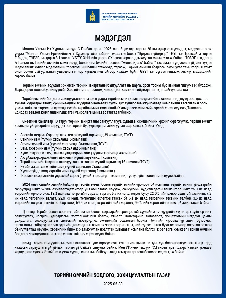 "Монгол Улсын Их Хурлын гишүүн С.Ганбаатар нь 2025 оны 6 дугаар сарын 26-ны өдөр сэтгүүлчдэд мэдээлэл өгөх үедээ “Монгол Улсын Ерөнхийлөгч У.Хүрэлсүх ойр тойрны хүрээлэл болох “Эрдэнэт үйлдвэр” ТӨҮГ-ын Ерөнхий захирал Г.Ёндон, ТӨБЗГ-ын дарга Б.Цэнгэл, “УБТЗ” ХНН-ийн дарга Х.Хэрлэн нараар дамжуулан мөнгө угааж байна. “ТӨБЗГ-ын дарга Б.Цэнгэл нь Төрийн өмчийн компаниуд, болон янз бүрийн төслөөс “мөнгө идэж” байна ” гэх ямар ч үндэслэлгүй, илт худал мэдээллийг хэвлэл мэдээллийн хэрэгсэл, нийгмийн сүлжээнд тарааж, Төрийн өмчийн бодлого, зохицуулалтын газрын хамт олон болон байгууллагын удирдлагын нэр хүндэд ноцтойгоор халдаж буйг ТӨБЗГ-ын зүгээс няцааж, энэхүү мэдэгдлийг гаргаж байна.