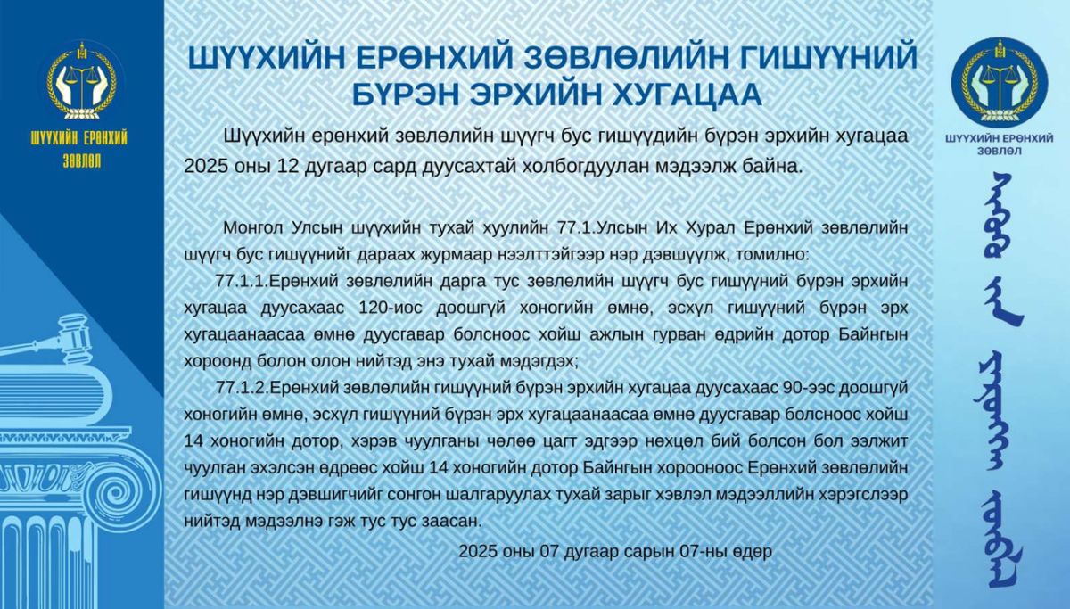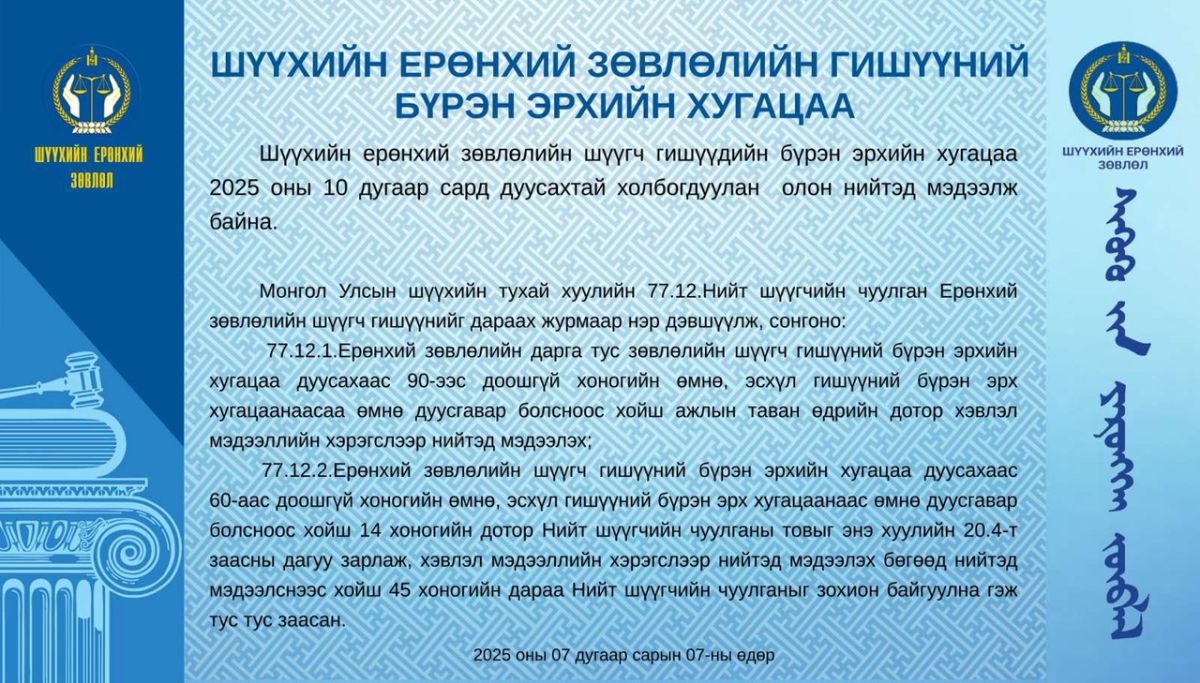 Шүүхийн Ерөнхий зөвлөлийн шүүгч гишүүдийн бүрэн эрхийн хугацаа 2025 оны 10 дугаар сард дуусах бол, шүүгч бус гишүүдийн бүрэн эрхийн хугацаа 2025 оны 12 дугаар сард дуусах аж. Үүнтэй холбогдуулан ШЕЗ-өөс дараах мэдээллийг өглөө.