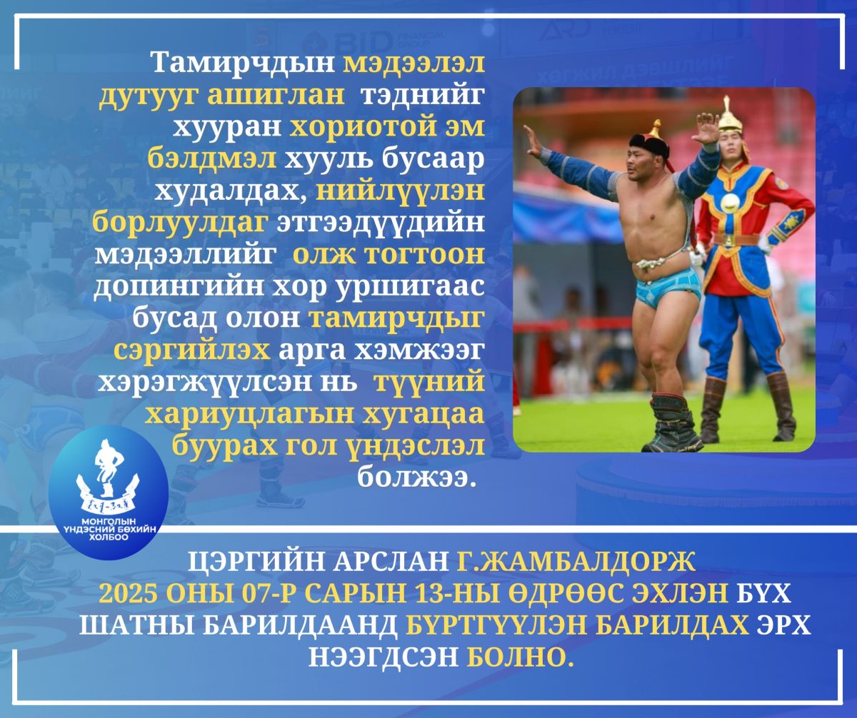 Иймд цэргийн арслан Г.Жамбалдорж 2025 оны 07-р сарын 13-ны өдрөөс эхлэн бүх шатны барилдаанд бүртгүүлэн барилдах эрх нь нээгдсэн болно" хэмээн мэдэгдсэн байна.