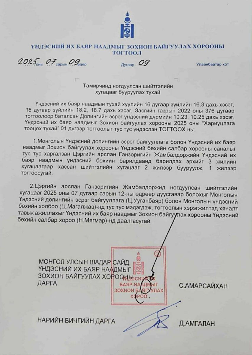 Энэ талаар Монголын үндэсний бөхийн холбооноос "Тамирчдын мэдээлэл дутууг ашиглан тэднийг хууран хориотой эм бэлдмэл хууль бусаар худалдах, нийлүүлэн борлуулдаг этгээдүүдийн мэдээллийг олж тогтоон допингийн хор уршигаас бусад олон тамирчдыг сэргийлэх арга хэмжээг хэрэгжүүлсэн нь түүний хариуцлагын хугацаа буурах гол үндэслэл болсон байна.