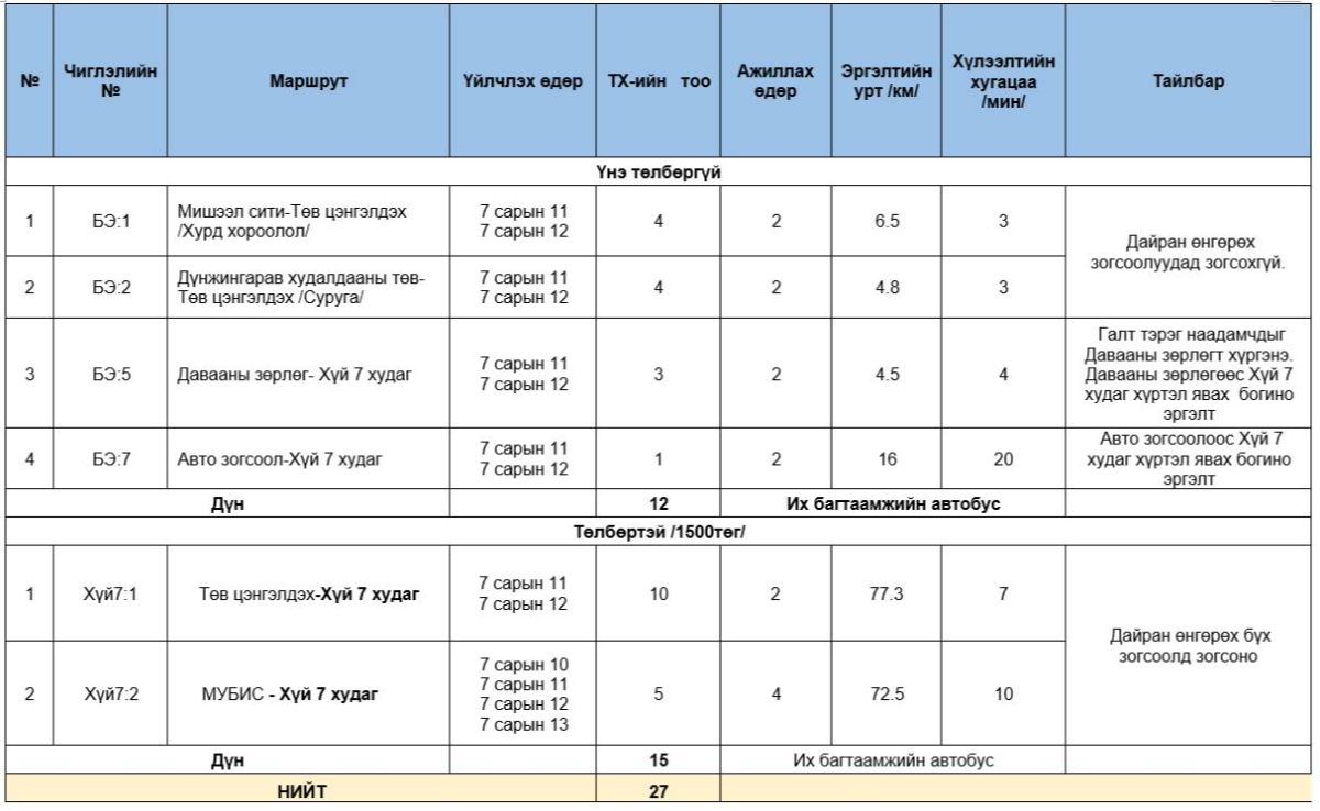 Хүй 7 худаг дахь наадамчин олонд зориулан өнөөдрөөс 13-ны өдрийг дуустал нийтийн тээврийн автобус үйлчилгээнд гарна. Тодруулбал, “МУБИС-ХҮЙ 7 ХУДАГ” чиглэлд их багтаамжийн 5 автобус, долоодугаар сарын 11,12-ны өдөр “Төв цэнгэлдэх-Хүй 7 худаг” чиглэлд 10 автбус тус тус үйлчилгээ үзүүлэх юм байна.