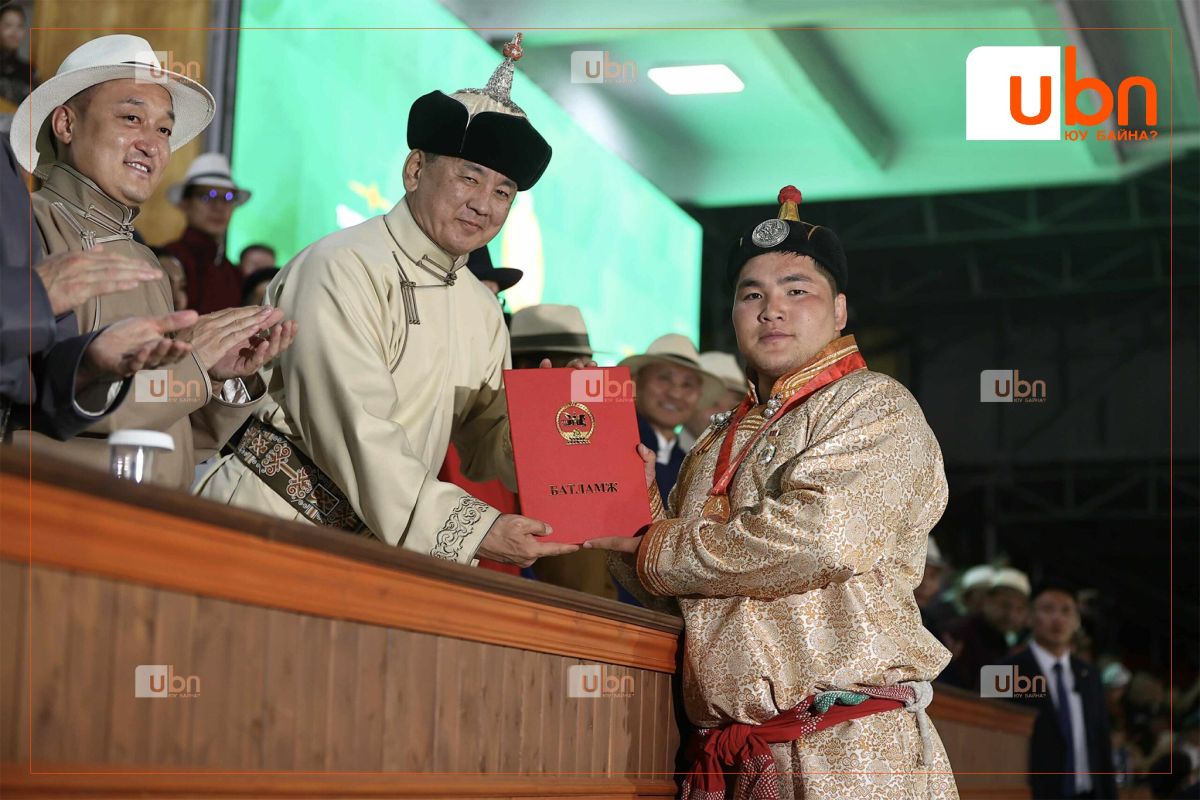 Монгол Улсын Ерөнхийлөгч Ухнаагийн Хүрэлсүх зарлиг гаргаж, Тулгар төрийн 2234 жил, Их Монгол Улс байгуулагдсаны 819 жил, Үндэсний эрх чөлөө, тусгаар тогтнолоо сэргээн мандуулсны 114 жил, Ардын хувьсгалын 104 жил, Ардчилсан хувьсгалын 35 жилийн ой, Улсын баяр наадмын Үндэсний бөхийн барилдаанд ес давж түрүүлсэн Баянхонгор аймгийн Жинст сумын харьяат, “Алдар” спорт хороо, “Тэргүүн Богд” дэвжээний бөх, Улсын начин Энхтүвшингийн Батмагнайд “Улсын арслан” цол олголоо.