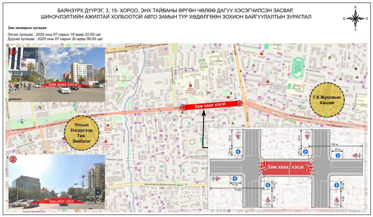 Баянзүрх дүүрэг, 3,15-р хороо Энхтайваны өргөн чөлөөний хэсэгчилсэн засвар, шинэчлэлтийн ажлын хүрээнд Бөхийн өргөөнөөс Зүүн дөрвөн замын уулзвар хүртэлх авто замыг хааж, шинэчилнэ.