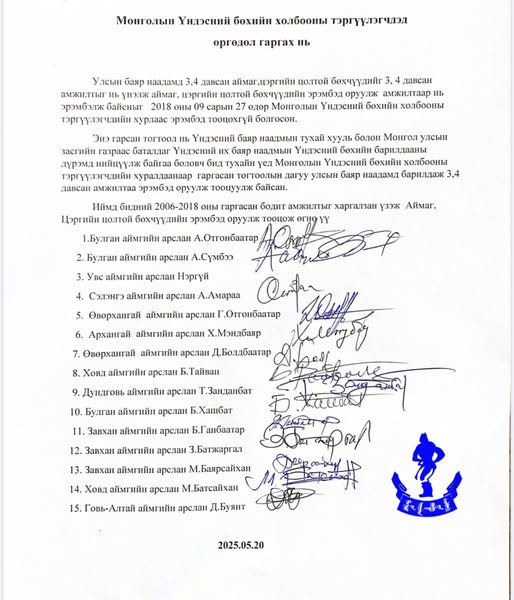Аймгийн арслан цолтой бөхчүүдээс ирүүлсэн өргөдлийг хэлэлцэж шийдвэрлэжээ. Энэ талаар Монголын үндэсний бөхийн холбооноос тодруулахад, "Монголын үндэсний бөхийн холбоонд нэр бүхий 16 аймгийн арслан цолтой бөхчүүд аймаг, цэргийн цолтны эрэмбийн талаар хүсэлт ирүүлснийг МҮБХ-ны Тэргүүлэгчдийн хурлаар хэлэлцэж шийдвэрийг гаргалаа.