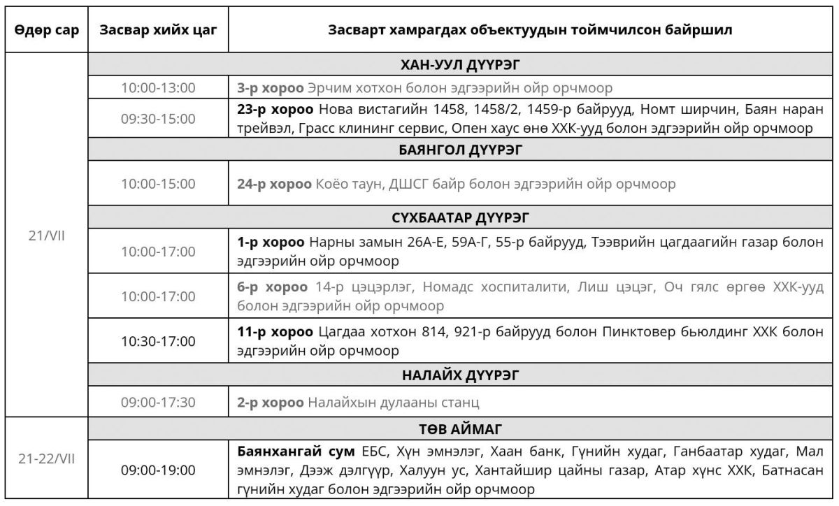 Маргааш буюу 2025 оны долоодугаар сарын 21-ний Даваа гарагт цахилгаан шугам сүлжээнд хийх засварын хуваарийг танилцуулж байна. Засвар хийх хугацаанд хэрэглээгээ түр зохицуулахыг анхаарууллаа.