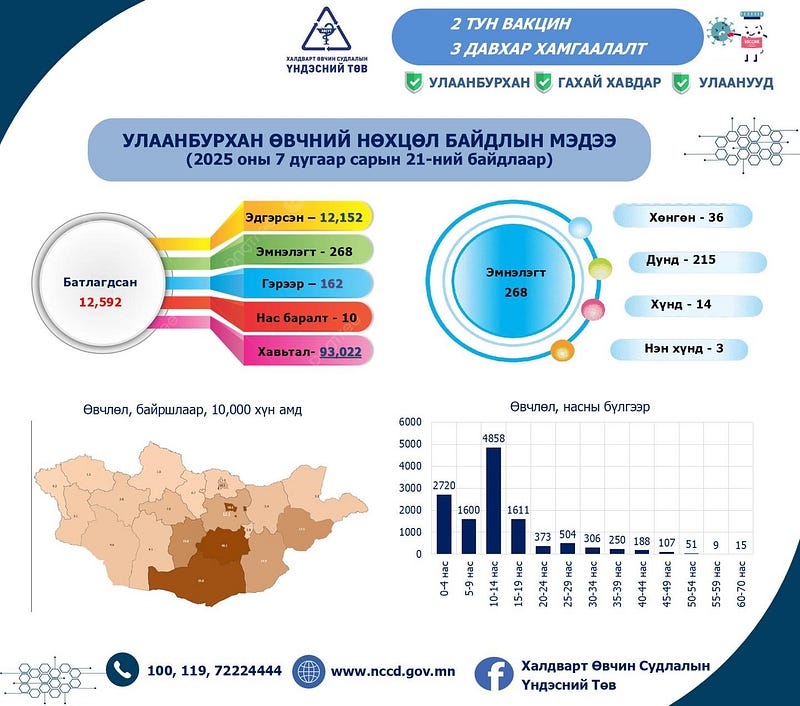 Улаанбурхан өвчний батлагдсан нийт тохиолдлын тоо долдугаар сарын 21-ны байдлаар 12592-д хүрч, 268 хүн эмнэлэгт хэвтэн эмчлүүлж байна. Нийт тохиолдлоос 12,152 хүн эдгэрсэн бол гэрээр 162 өвчтөн эмчлүүлж байна. Мөн нас баралтын тоо 10 хүрчээ. ХӨСҮТ-өөс хэрхэн урьдчилан сэргийлэх талаар тодруулахад, "Улаанбурхан өвчин нь халдварлалт өндөртэй ч вакцинаар сэргийлэгдэх боломжтой халдварт өвчин юм. Улаанбурхан өвчний батлагдсан тохиолдлын хавьтлаас улаанбурхнаар өвдөөгүй бол 72 цагийн дотор улаанбурханы эсрэг вакцинд хамрагдан өөрийгөө болон бусдыг улаанбурхан өвчнөөс хамгаалаарай." гэлээ.