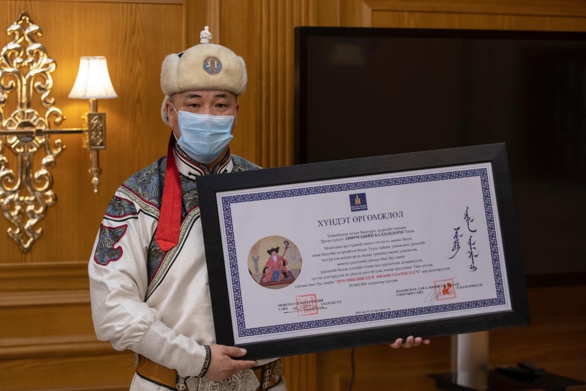 2019 оны “Шилдэг өвлөн уламжлагч”-аар Нийслэл хотын Баянзүрх дүүргийн иргэн, туульч Авирмэдийн Балдандорж шалгарч, 2020 оны 2 дугаар сард Монгол Улсын Ерөнхий сайд У.Хүрэлсүхээс “Хүндэт өргөмжлөл”-өө гардан аваад байсан юм. Цаг үеийн нөхцөл байдлаас шалтгаалан олгоогүй байсан мөнгөн шагналыг Соёлын сайдын багцаас шийдвэрлэснийг сайд С.Чулуун өнөөдөр туульч А.Балдандоржид гардууллаа.