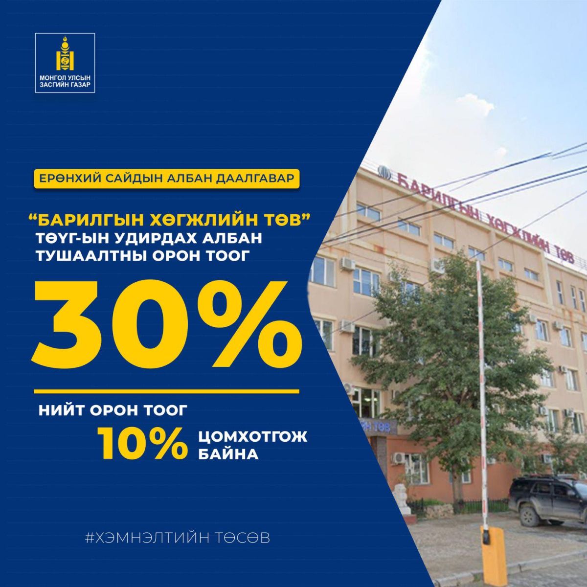 Энэ дагуу “Барилгын хөгжлийн төв” ТӨҮГ байгууллагынхаа эдийн засаг, үр ашгийн тооцоо судалгаанд үндэслэн сул орон тоог царцааж, чиг үүргийн давхардлыг арилгаж, төсөв хэмнэх үүднээс удирдах албан тушаалтнуудынхаа орон тоог 30 хувь, нийт ажилтнуудаа 10 хувиар цомхотгож эхэлжээ.