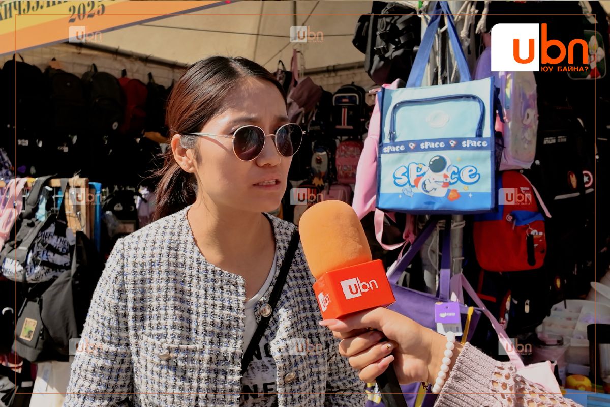 Үнийн судалгаа хийхээр цааш явтал төрөл бүрийн цүнхний худалдаа эгнэж байлаа. Цүнхний худалдаан дээр хүмүүст цүнхээ танилцуулан зогсох худалдаачин охинтой хэсэг ярилцахад: “Энэ жил хүмүүс үнэ гэхээсээ илүү чанарт анхаарч байна. Эцэг, эхчүүд хүүхдэдээ хөнгөн, ус бороо чийг нэвтрүүлдэггүй цүнх сонгож худалдан авах нь их болсон байна. Жишээ нь манайд нэгдүгээр ангийн хүүхдийн нурууны стандартад тохирсон загвар өнгөний сонголттой цүнхнүүд, ахлах дунд ангийн цүнхний сонголт олон. Бага ангийн хүүхдийн чанар материал сайтай, цацруулагчтай цүнх 95,000-135,000 төгрөгийн хооронд, дунд анги, ахлах ангийн цүнх загвар бүрээсээ хамааран 90,000-250,000 хооронд байна. Худалдан авагчид захаас илүү үзэсгэлэн худалдаанууд хямд байна гэж хэлдэг” хэмээсэн юм.