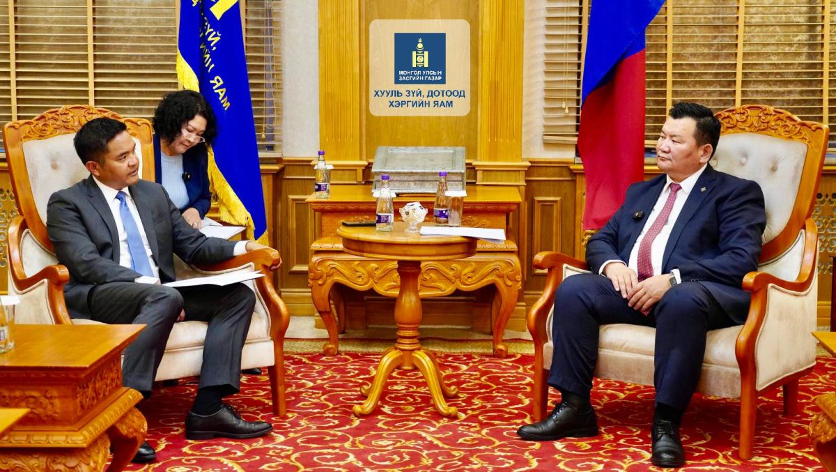 Уулзалтын эхэнд Л.Мөнхбаатар сайд ноён Элчин сайдад хандан салбарт хэрэгжүүлэхээр ажиллаж буй тэргүүлэх бодлого чиглэлийнхээ талаар мэдээлэл өглөө. Тодруулбал, “Эрх зүйн шинэтгэл-2” хөтөлбөр хэрэгжүүлэх, улсын хэмжээнд мөрдөж буй хууль, тогтоомжуудад хүний эрхийн үнэлгээ хийж холбогдох арга хэмжээ авах, “Эдийн засгийг эрх зүйгээр дэмжих” хөтөлбөр болон хөтөлбөрийн хүрээнд гадаадын хөрөнгө оруулалтыг хамгаалах талаар хууль, дүрмүүдэд өөрчлөлт оруулах чиглэлд ажиллаж эхэлсэн талаар дурдав.