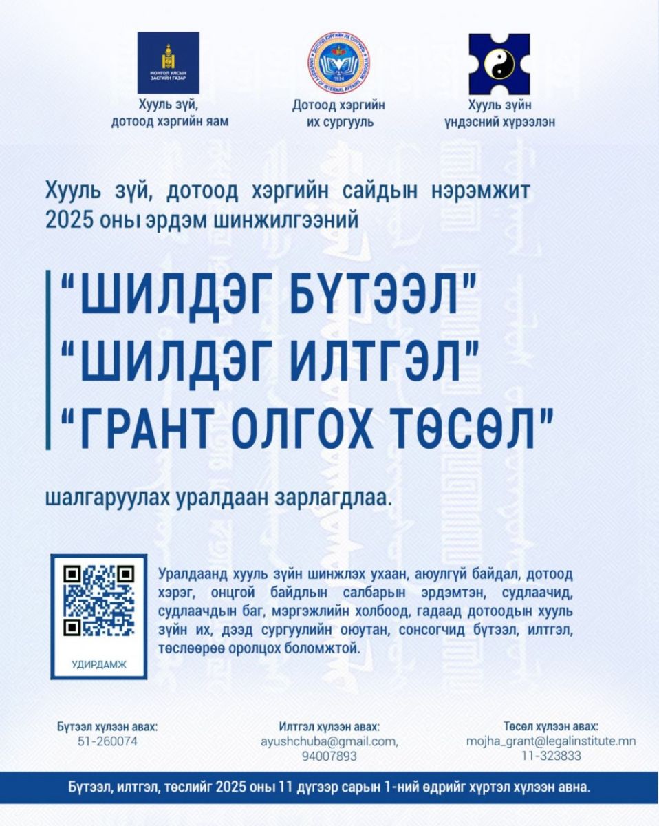 Харин грант олгох шинжлэх ухаан, технологийн төслийн шалгаруулалт нь суурь судалгаа, хавсарга судалгаа, инновацын төсөл гэсэн гурван чиглэлээр явагдах ажээ. Уралдаанд оролцох шилдэг бүтээлийг Хууль зүй, дотоод хэргийн яам, шилдэг төслийг Хууль зүйн үндэсний хүрээлэн, шилдэг илтгэлийг Дотоод хэргийн их сургуульд ирэх 11 дүгээр сарын 1-ний өдрийг хүртэл хүлээн авах юм байна.