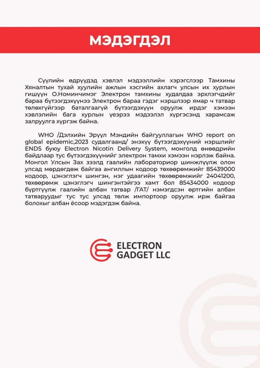 Монгол Улсад электрон тамхины зах зээл дээрх RELX, Snowplus болон Vookbar брэндийн бүтээгдэхүүнүүдийг албан ёсны эрхтэйгээр гаалийн төв лабораторийн шинжилгээнд хамрагдан, зохих ёсны татваруудаа төлж, хамрагдах кодын дагуу оруулж ирж буй гэдгээ “Электрон Гаджет” ХХК, “Рич Эксим Лайн” ХХК, “Эм Эн Иновейшн Глобал Смарт Технологи” ХХК-иуд тус бүр мэдэгдлээ.