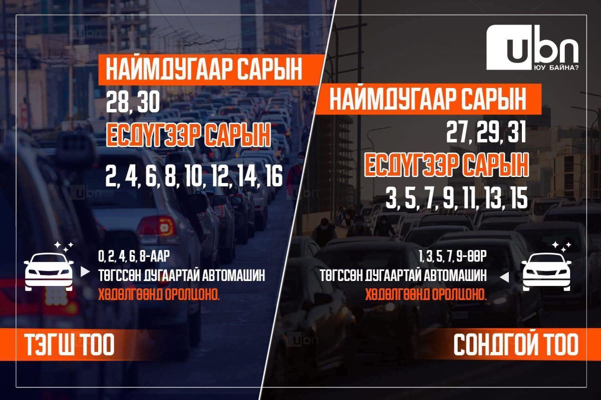 Хичээл сургууль эхэлсэнтэй холбогдуулан өнгөрсөн наймдугаар сарын 27-ноос эхлэн автомашинуудыг тэгш, сондгой дугаараар төгссөнөөр нь ангилан замын хөдөлгөөнд оролцуулж буй. Энэ дагуу өнөөдөр сондгой тоогоор төгссөн автомашинууд замын хөдөлгөөнд оролцох юм.