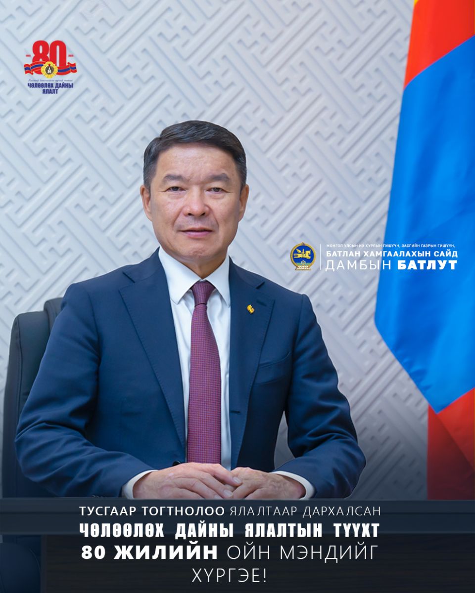 Эрхэм хүндэт ахмад дайчид, үе үеийн эх орончид, Зэвсэгт хүчин, Төрийн цэргийн болон хууль сахиулах байгууллагын алба хаагчид, иргэд олон түмэн та бүхэндээ Чөлөөлөх дайны ялалтын түүхт 80 жилийн ойн баярын мэндийг өргөн дэвшүүлье!