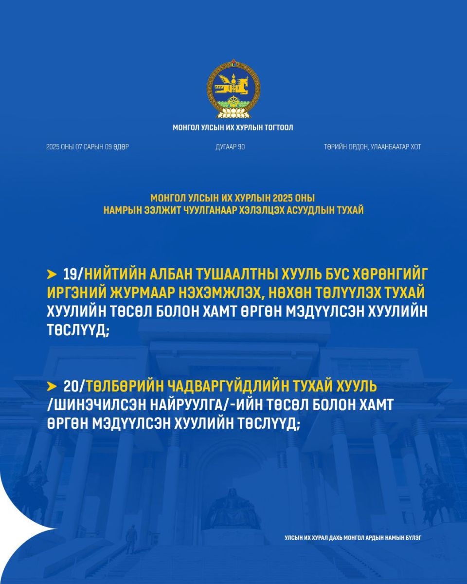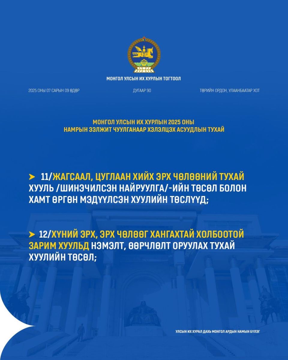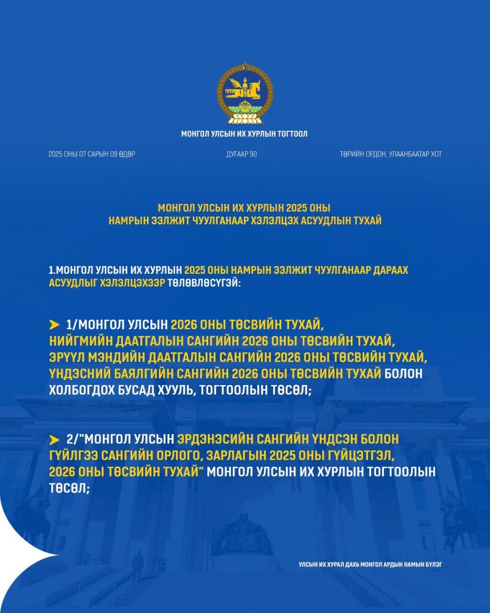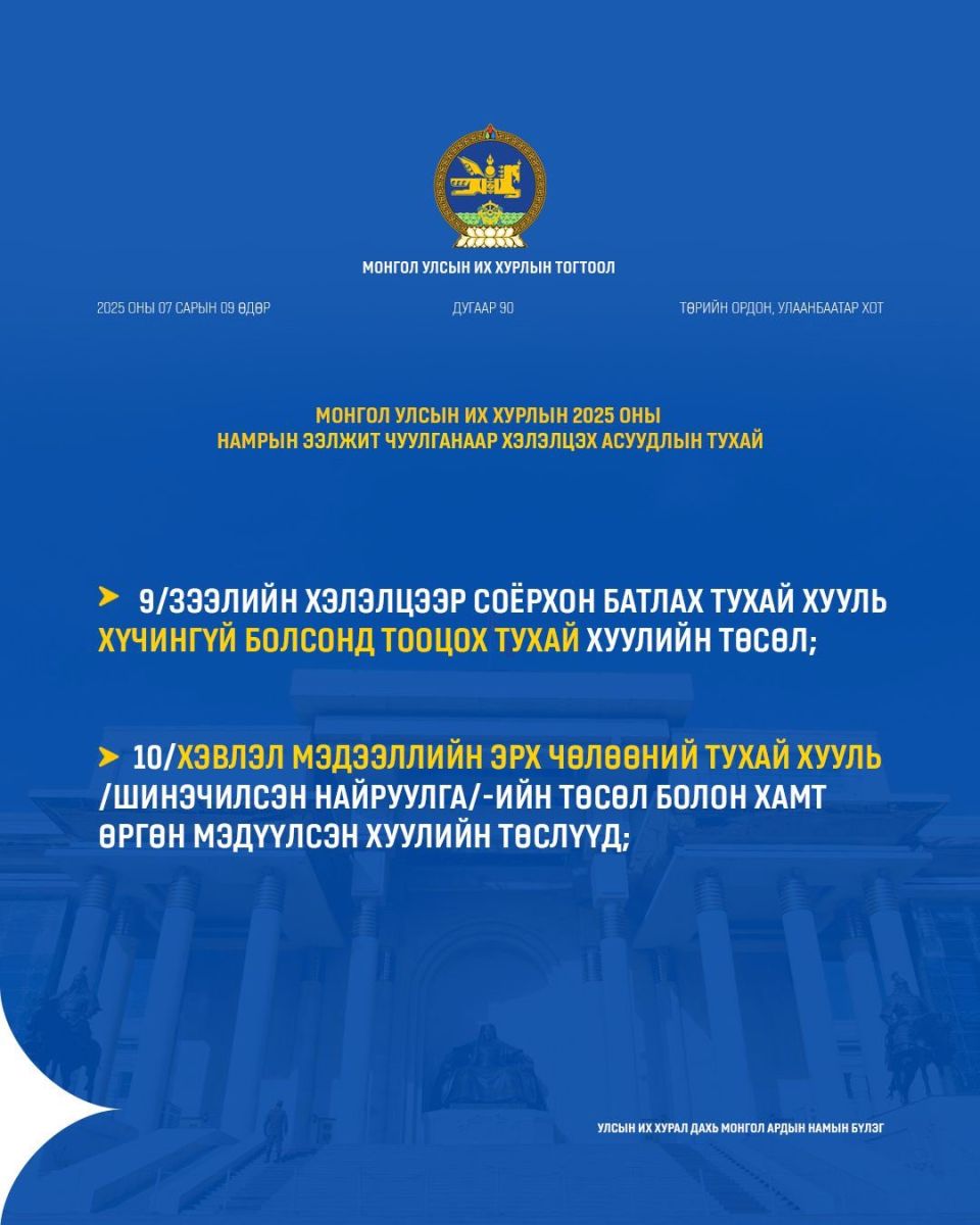 УИХ-ын намрын ээлжит чуулган ирэх долоо хоногийн Даваа гарагт буюу есдүгээр сарын 15-нд нээлтээ хийнэ. Намрын чуулганаар ирэх оны Төсвийн тухай хууль болон дараах хуулийн төслүүдийг хэлэлцэнэ.