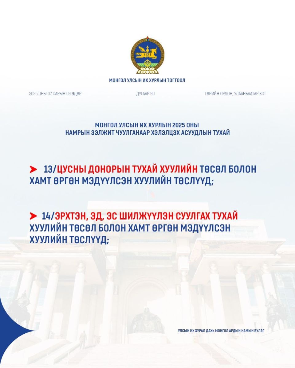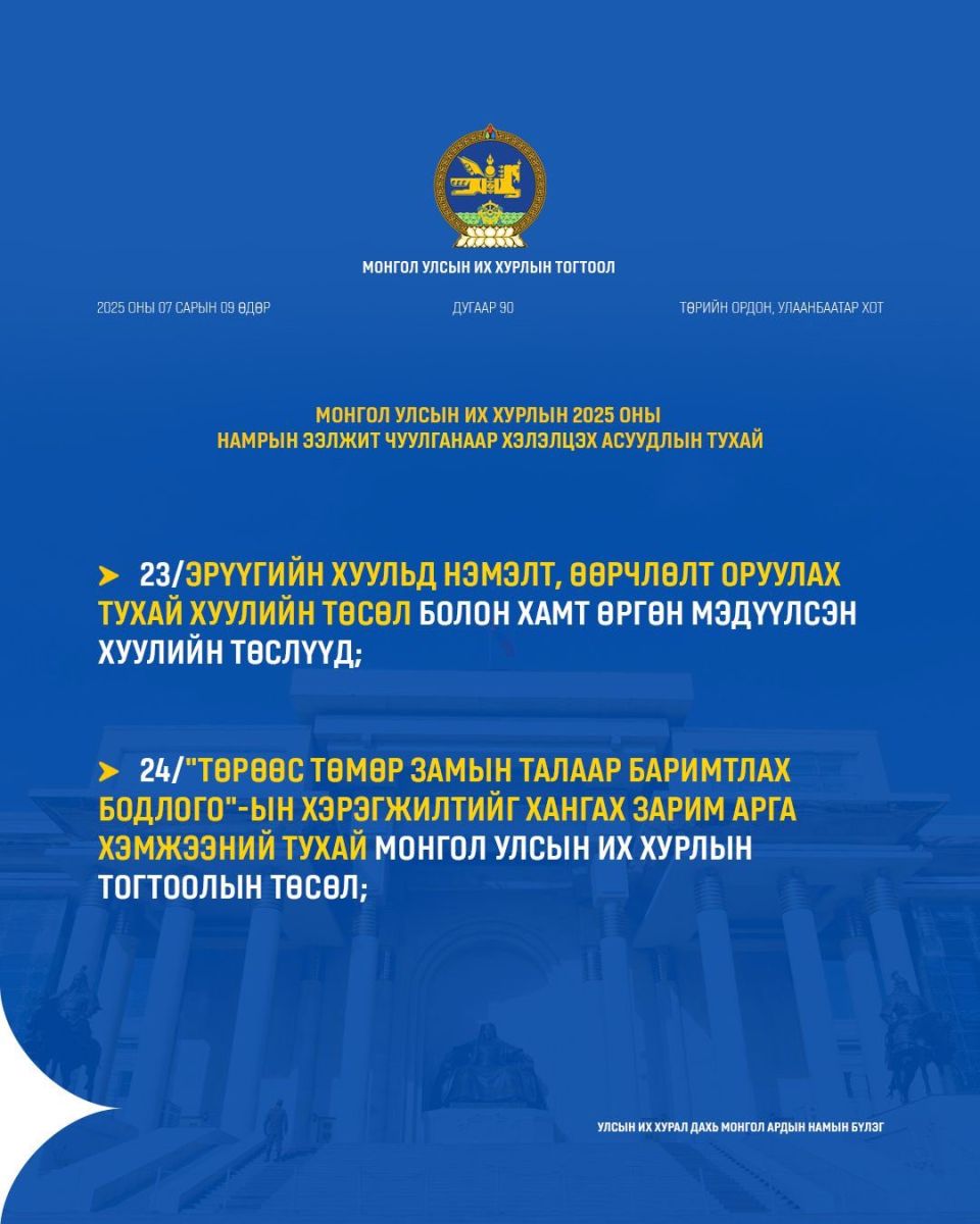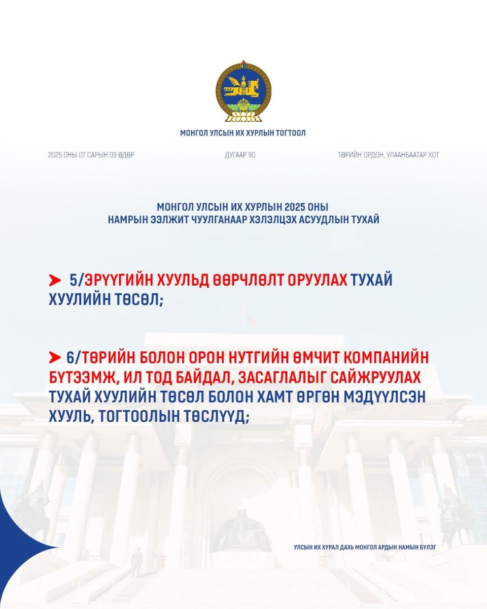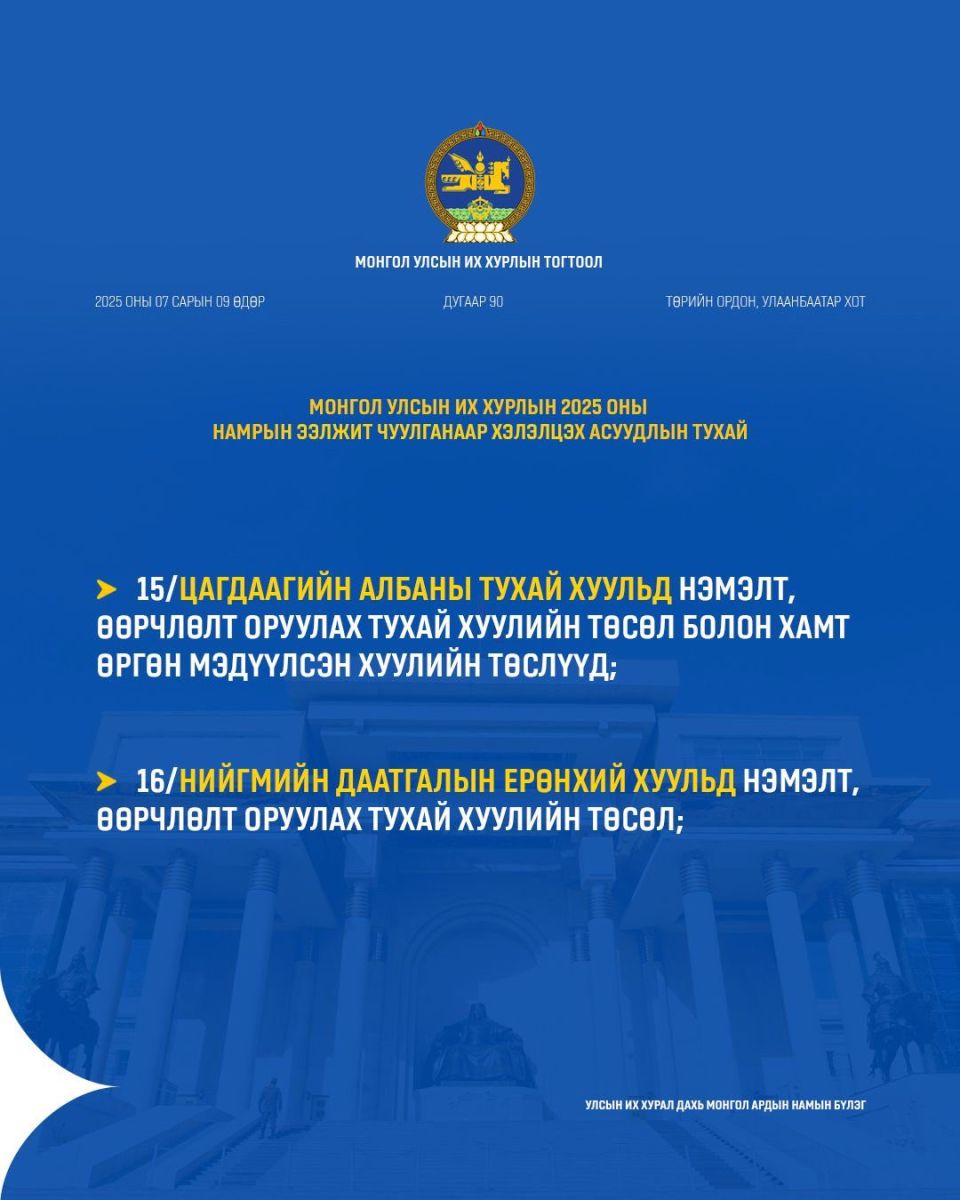 УИХ-ын намрын ээлжит чуулган ирэх долоо хоногийн Даваа гарагт буюу есдүгээр сарын 15-нд нээлтээ хийнэ. Намрын чуулганаар ирэх оны Төсвийн тухай хууль болон дараах хуулийн төслүүдийг хэлэлцэнэ.