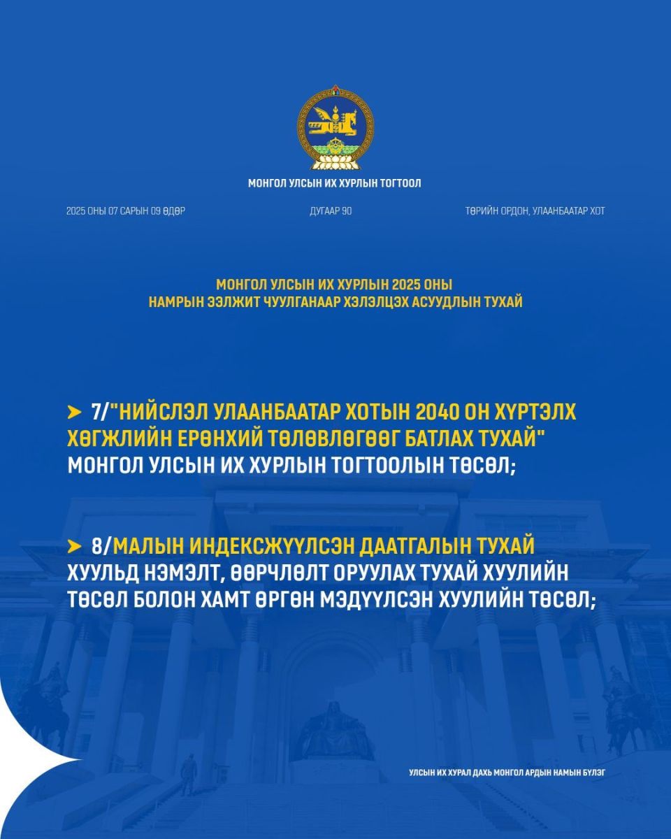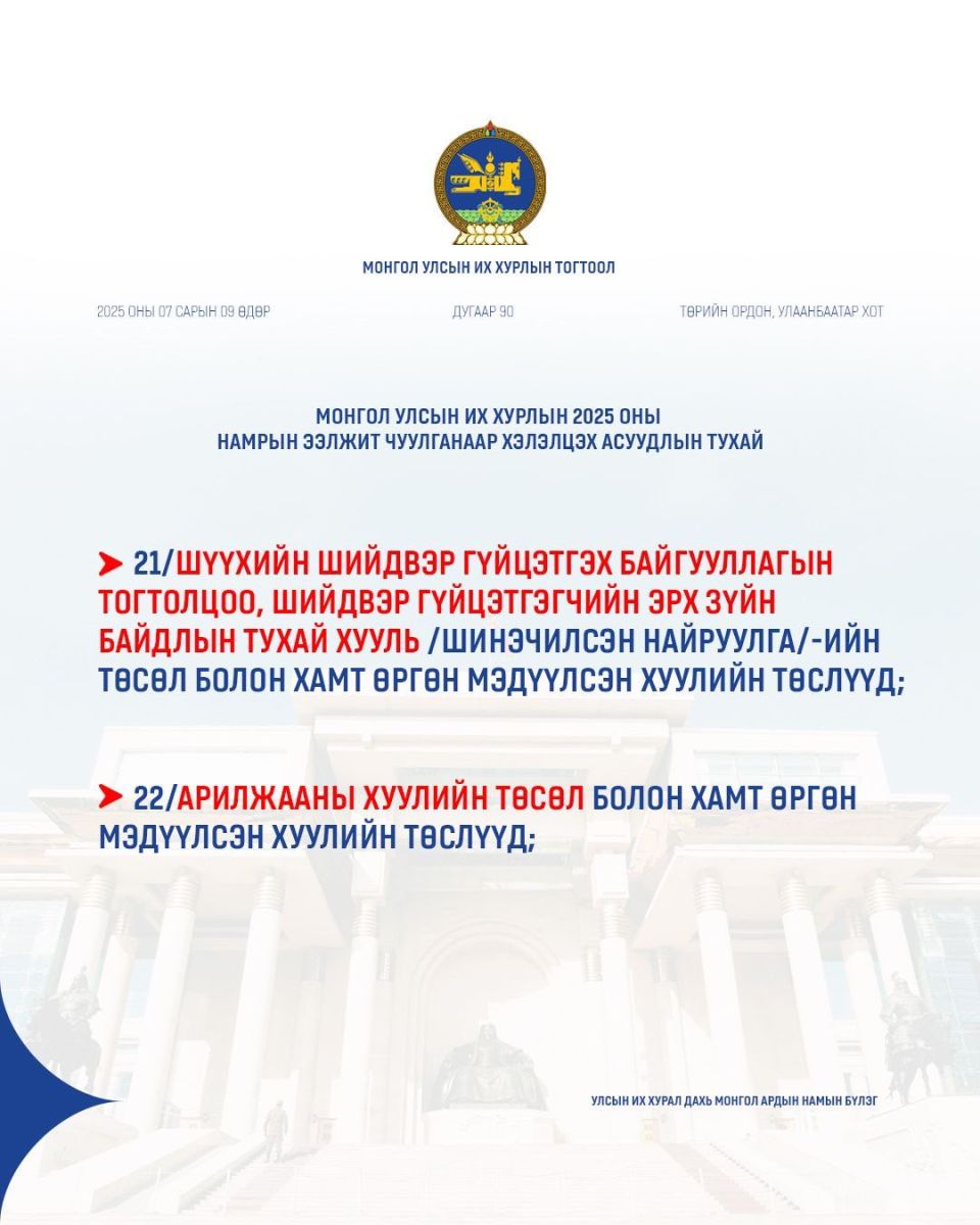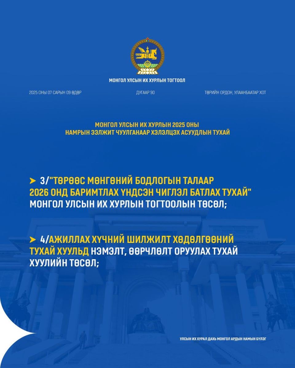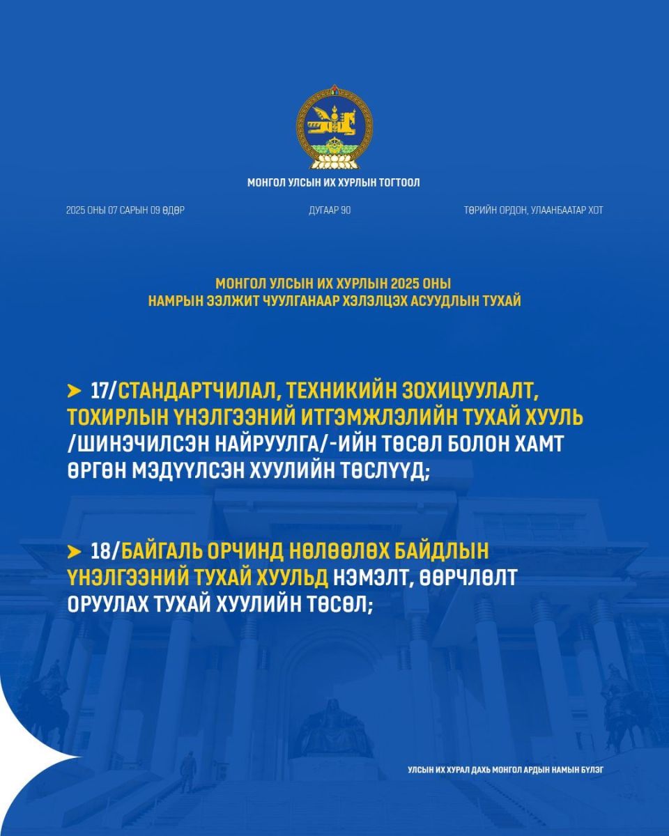 УИХ-ын намрын ээлжит чуулган ирэх долоо хоногийн Даваа гарагт буюу есдүгээр сарын 15-нд нээлтээ хийнэ. Намрын чуулганаар ирэх оны Төсвийн тухай хууль болон дараах хуулийн төслүүдийг хэлэлцэнэ.