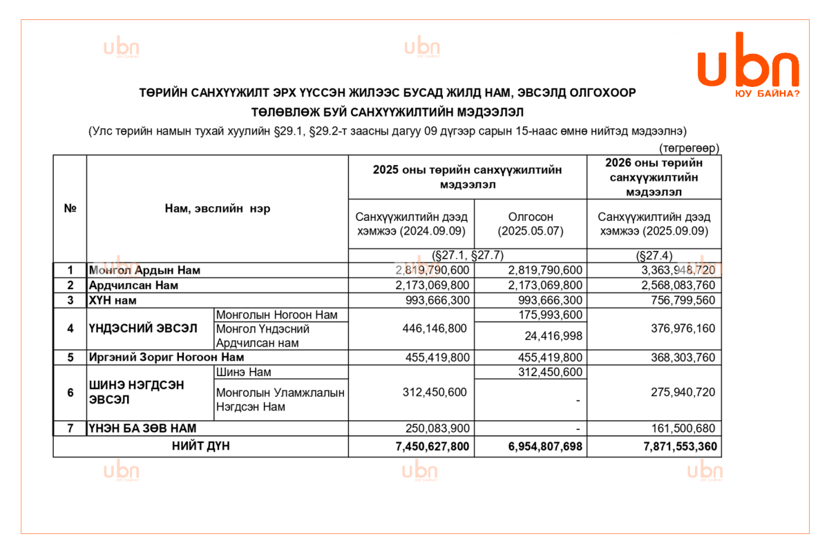 Нам, эвсэлд 2026 онд олгож болох төрийн санхүүжилтийн дээд хэмжээний мэдээллийг хүснэгтээр үзүүллээ.