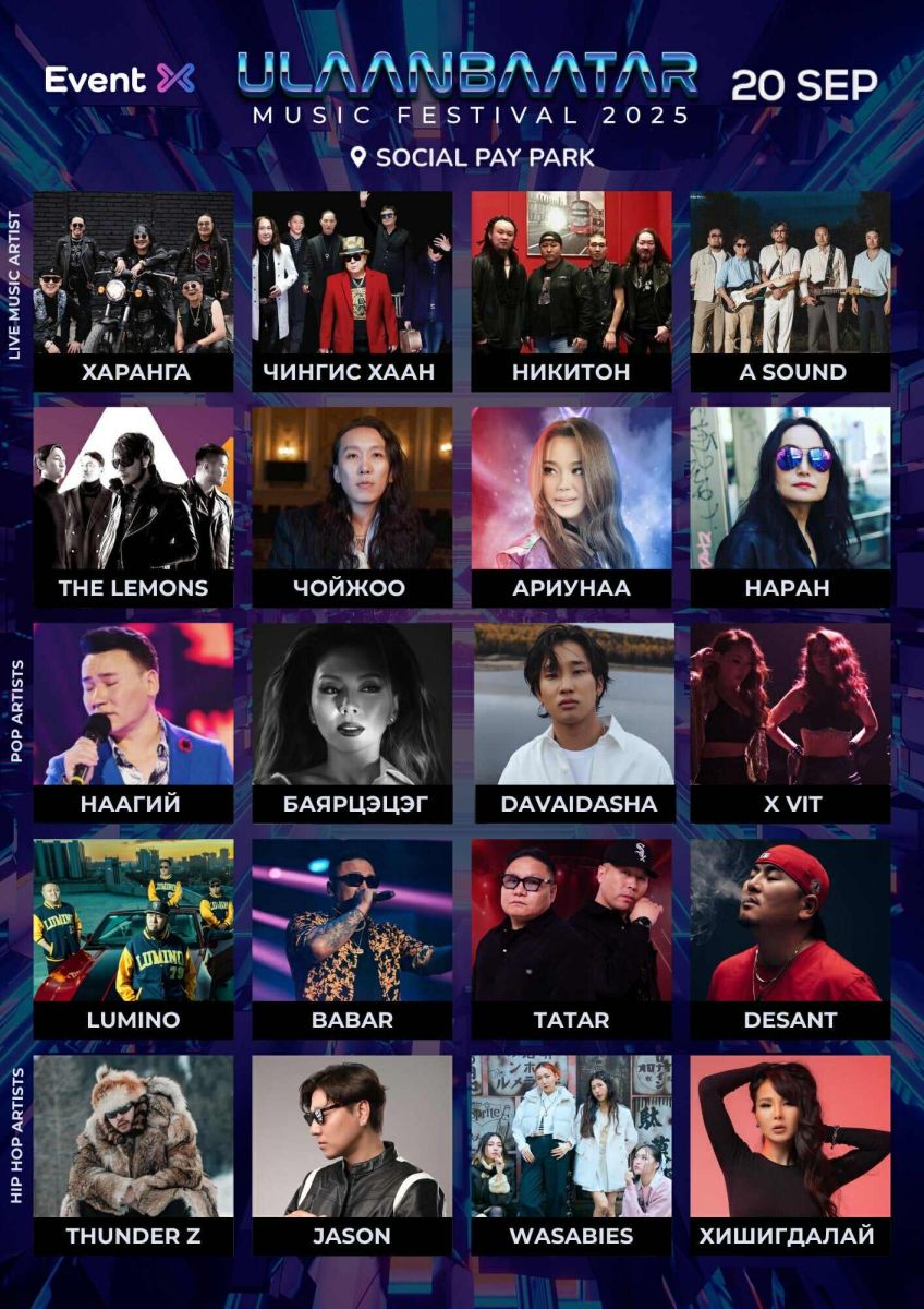 “Ulaanbaatar Music Festival 2025” – Улаанбаатар хотын түүхэнд анх удаа зохион байгуулагдаж буй хамгийн том задгай талбайн фестиваль Улаанбаатар хот том хотын статустай болсноос хойш анх удаа, олон улсын жишигт нийцсэн, ийм өргөн цар хүрээтэй “Ulaanbaatar Music Festival 2025” зохион байгуулагдах гэж байна. Энэхүү фестиваль нь зөвхөн нэг өдрийн тоглолт бус, цаашид жил бүр уламжлал болгон зохион байгуулагдах, Монголын хөгжмийн ертөнцийн хамгийн том наадам болох эхлэл юм. Тус фестиваль нь Монголын рок, поп, хип хоп, жазз болон амьд хөгжмийн шилдэг уран бүтээлчдийг нэгэн тайзнаа цуглуулж, дэлхийн хэмжээний хөгжмийн баярын уур амьсгалыг Улаанбаатар хотын зүрхэнд авчирч байна.
