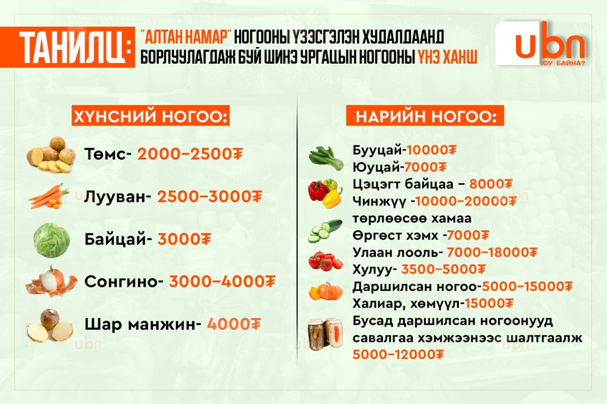 Тэгвэл “Алтан намар-2025” өргөтгөсөн худалдаанд гарч байгаа ногооны үнийн мэдээллийг сонирхуулъя. /Кг тутамд/