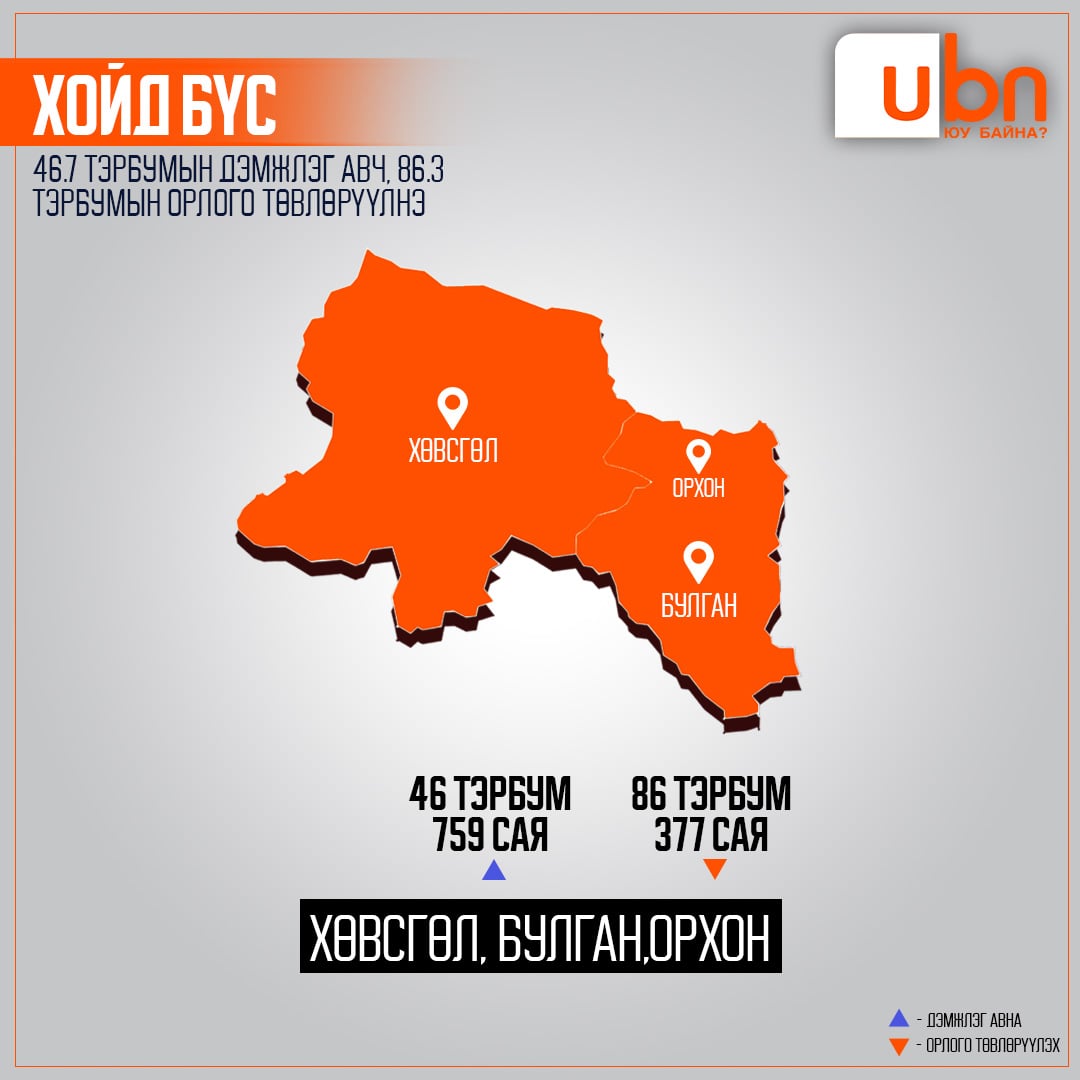 Хойд бүсийн гурван аймгаас Хөвсгөл, Булган аймаг нийт 46 тэрбум 759 сая төгрөгийн санхүүгийн дэмжлэг авах бол Орхон аймаг 86 тэрбум 377 сая төгрөгийн орлогыг улсын төсөвт төвлөрүүлэх аж.