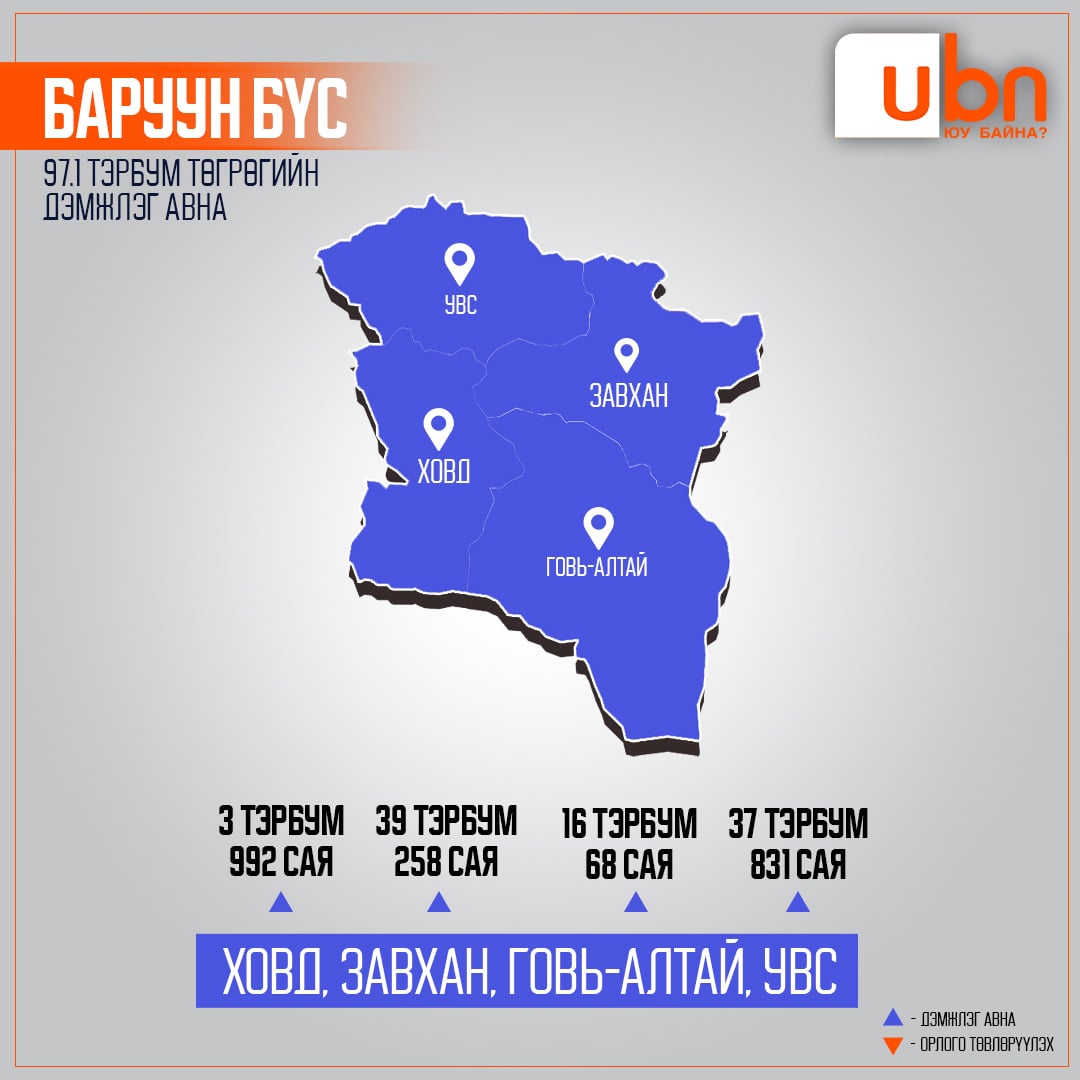 Баруун бүс буюу Ховд, Завхан, Говь-Алтай, Увс аймаг нийт 97 тэрбум 149 сая төгрөгийн төсвийн дэмжлэг авах аж. Үүнийг задалж үзвэл, Ховд 3 тэрбум 992 сая, Завхан 39 тэрбум 258 сая төгрөг, Говь-Алтай 16 тэрбум 68 сая төгрөг, Увс 37 тэрбум 831 сая төгрөгийн дэмжлэг авна.