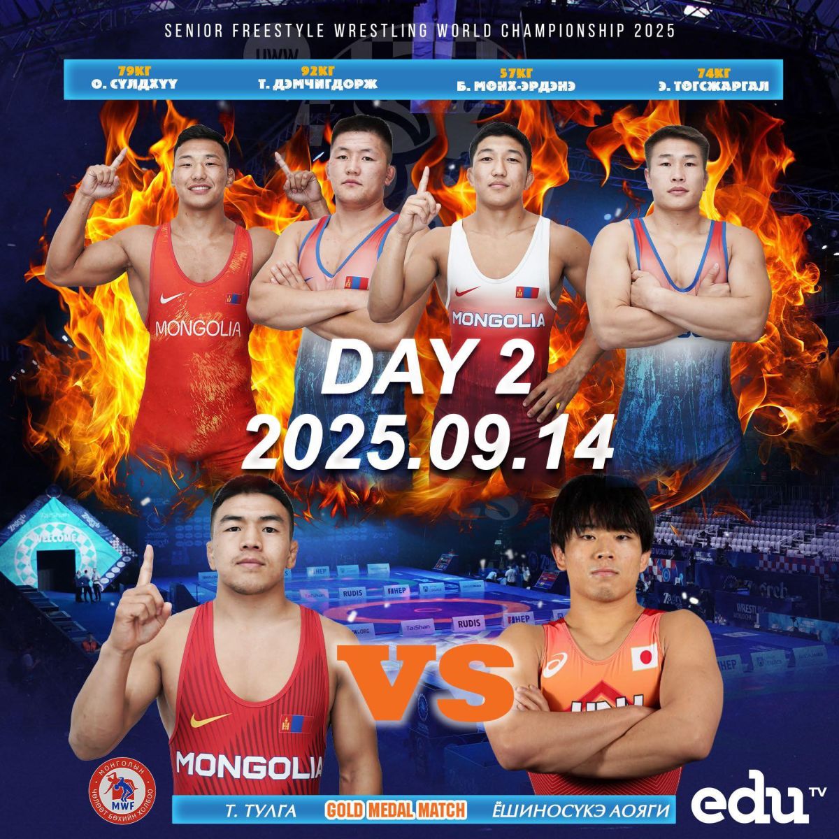 Өнөөдөр эрэгтэйчүүдийн 57, 74, 79, 92 кг-ын жингийн хэсгийн барилдаантай. Монгол Улсаа төлөөлж, 79 кг-ын жинд О.Сүлдхүү, 57 кг-ын жинд Б.Мөнх-Эрдэнэ, 74 кг-ын жинд Э.Төгсжаргал, 92 кг-ын жинд Т. Дэмчигдорж нар барилдана.