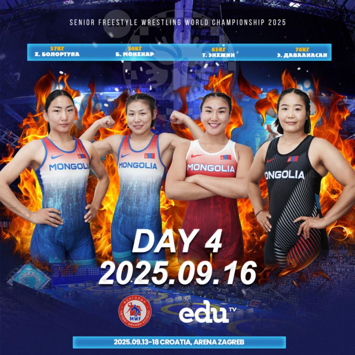Хорватын Загреб хотноо явагдаж буй чөлөөт бөхийн ДАШТ-ий дөрөв дэх өдөр эмэгтэйчүүдийн 50 кг-ын жинд Б.Мөнхнар, 57 кг-д Х.Болортуяа, 65 кг-д Т.Энхжин, 76 кг-ын жинд Э.Даваанасан нар хүч сорих болно.