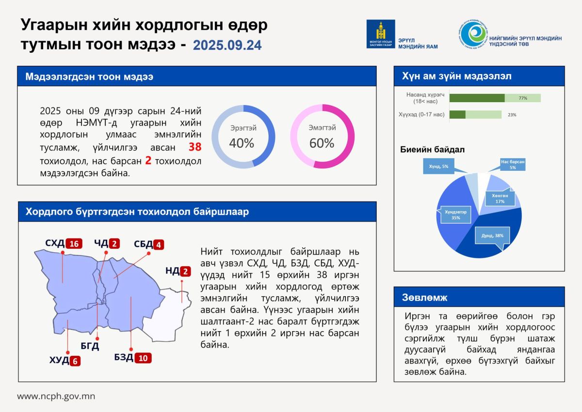 НЭМҮТ-өөс угаарын хийн хордлогын мэдээллийг гаргажээ. Тодруулбал, энэ сарын 24-нд буюу өчигдөр НЭМҮТ-д угаарын хийн хордлогын улмаас 38 иргэн эмнэлгийн тусламж үйлчилгээ авсан байна. Мөн 2 хүн угаартаж нас барсан байна.