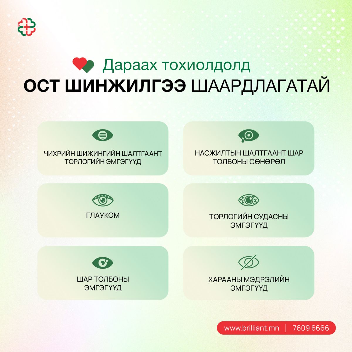 Та нүднийхээ эрүүл мэндийг дэлхийн дэвшилтэт технологиор шалгуулж, итгэлтэй, найдвартай онош авахыг хүсвэл Бриллиант Нэгдсэн Эмнэлэгт хандаарай.