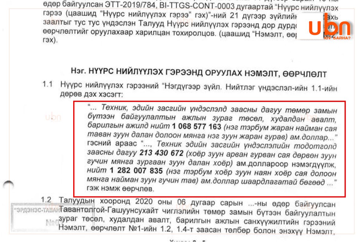 Харин хоёр дахь өөрчлөлтийг 2020 оны зургаадугаар сарын 10-ны өдөр хийжээ. Эл өөрчлөлтөөр Тавантолгой Гашуунсухайт чиглэлийн төмөр замын ТЭЗҮ-д тусгагдсан нэмэлт ажилтай холбогдуулан 214 сая ам.доллар нэмж шаардлагатай болсон гэдгийг оруулжээ. Тодруулбал, нэмэлт ажилд анх 1 тэрбум 68 сая ам.доллар шаардлагатай байсанд тодотгол оруулж 214 сая ам.доллароор нэмэгдүүлж 1 тэрбум 282 сая ам.долларын санхүүжилтийг зарцуулахаар тусгажээ. Ингэснээр гэрээний нийт дүнгээр анх 682 сая ам.долларын төлбөрийг нүүрсээр хийхээр байсан бол энэхүү дүн нь 896 сая ам.доллар болж өссөн.