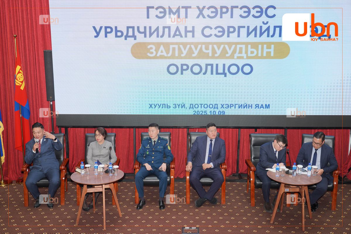 Салбар хэлэлцүүлгийн эхэнд Хууль зүй, дотоод хэргийн яамны Төрийн захиргааны удирдлагын газрын дарга Д.Үржинсүрэн, Соёл, спорт, аялал жуулчлал, залуучуудын яамны Залуучуудын хөгжлийн бодлогын хэрэгжилтийг зохицуулах газрын мэргэжилтэн А.Балдорж, Авлигатай тэмцэх газрын Урьдчилан сэргийлэх, соён гэгээрүүлэх хэлтсийн ажилтан комиссар Д.Балдандорж, Гэмт хэргээс урьдчилан сэргийлэх ажлыг зохицуулах зөвлөлийн Ажлын албаны ахлах мэргэжилтэн У.Дэлгэрхишиг, Төрийн тусгай албан хаагчдын нэгдсэн эмнэлгийн чанарын менежер Д.Бархасболд нар илтгэл танилцуулж, мэдээлэл хүргэлээ.