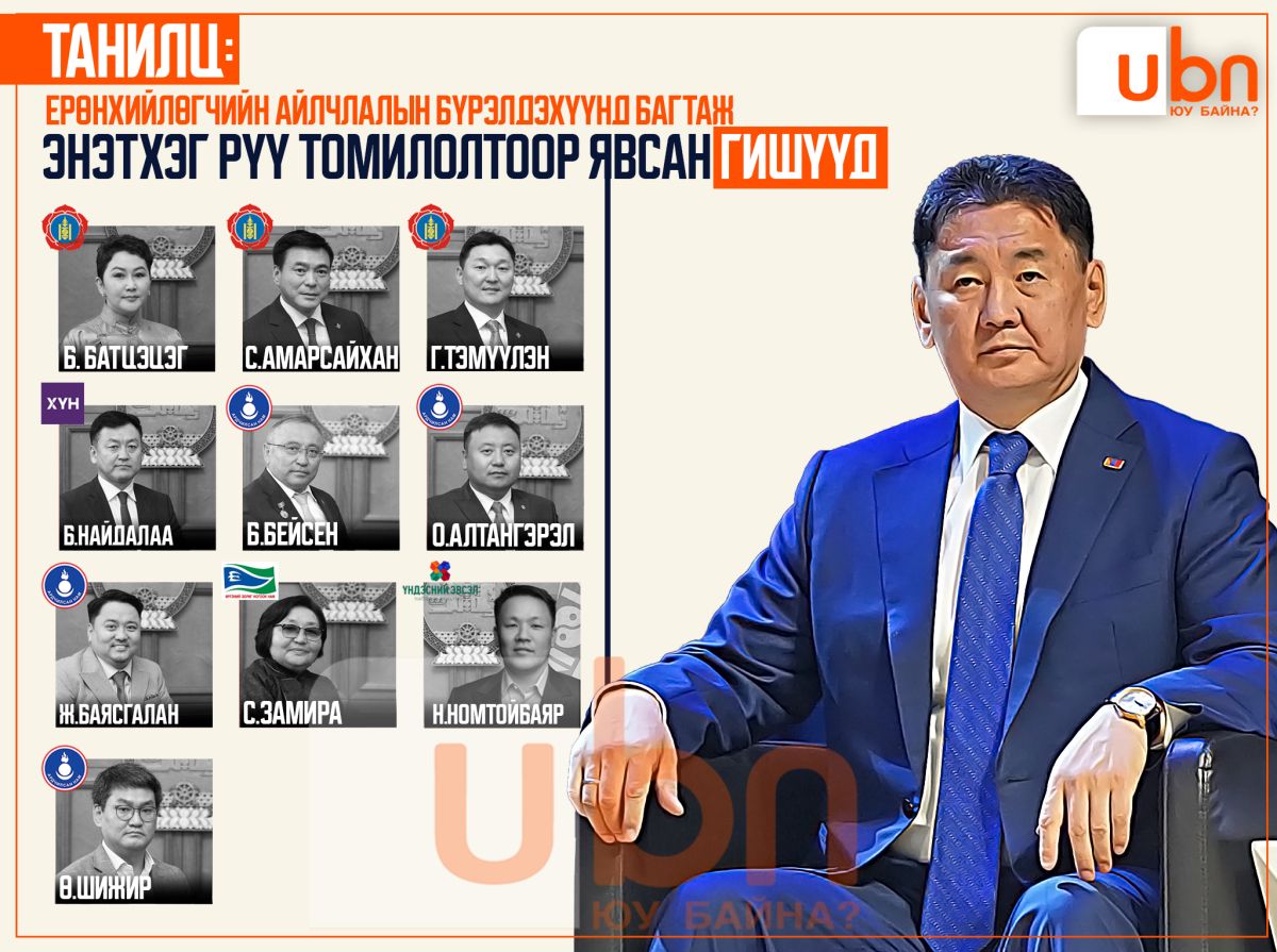 Эх сурвалжийн мэдээлж буйгаар, Гадаад харилцааны сайд Б.Батцэцэг, Шадар сайд С.Амарсайхан, УИХ-ын гишүүн Г.Тэмүүлэн, Б.Найдалаа, Б.Бейсен, О.Алтангэрэл, Ж.Баясгалан, С.Замира, Н.Номтойбаяр, Ө.Шижир нар айлчлалын багт багтсан байна.