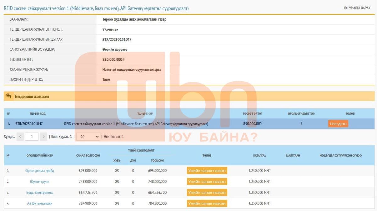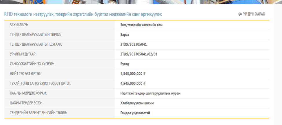 Гэтэл RFID систем сайжруулалт version 1 (Middleware, Бааз гэх мэт), API Gateway (өргөтгөл суурилуулалт) нэрээр ЗТЯ-наас 850 сая төгрөгийн тендерийг зарлажээ. Уг тендерийг 2025 оны аравдугаар сарын 3-ны өдөр зарласан бөгөөд тендерийн материалыг хүлээн авч дуусжээ. Ингэхдээ тендерт Оргил дельта трейд, Юуком групп, Ай Өү техноложи гэх гурван компаниас гадна өмнөх тендерүүдэд шалгарч байсан Бодь-Электроникс ХХК мөн адил үнийн саналаа хүргүүлж, оролцсон байх аж. Тодруулбал, дөрвөн компанийн үнийн саналаас хамгийн бага үнэ буюу 664,726,700 төгрөгийн саналыг Бодь-Электроникс ХХК дэвшүүлж, оролцжээ. Одоогоор гүйцэтгэгчийг шалгаруулсан гэх мэдээлэл байхгүй байна.