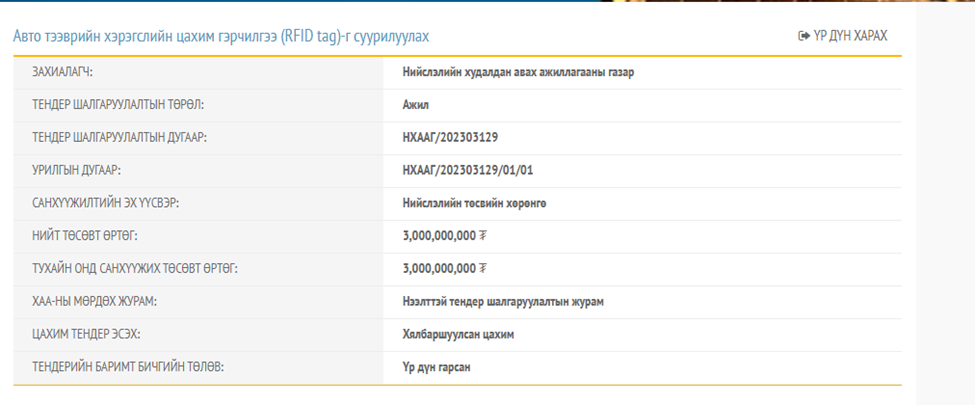 Жишээлбэл, 2023 оны гуравдугаар сарын 28-наас дөрөвдүгээр сарын 27-ны хооронд нийслэлээс “Автомашины цахим гэрчилгээ (RFID tag)-г суурилуулах” ажлын гүйцэтгэгчийг сонгон шалгаруулах тендерийг зарласан байдаг. Гурван тэрбум төгрөгийн төсөвт өртөг бүхий уг тендерт “Бодь-Электроникс” 2.97 тэрбумын саналаар ганцаараа оролцож, өрсөлдөгчгүйгээр шалгарсан байдаг.